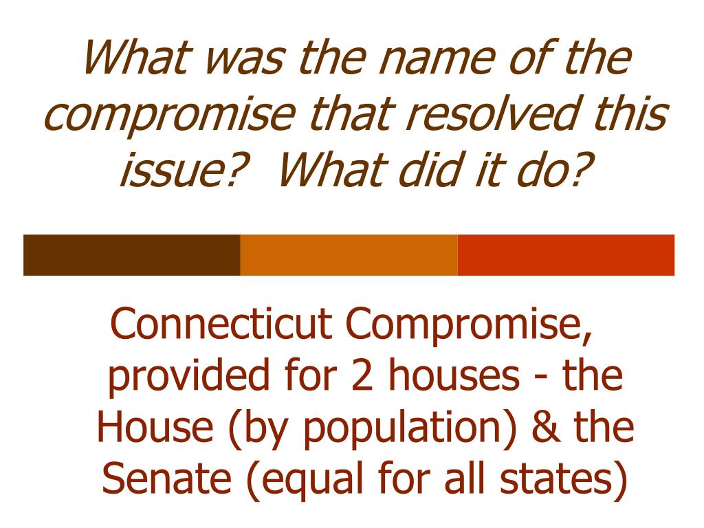 What was the name of the compromise that resolved this issue? What did it do? • Connecticut Compromise, provided for 2 houses - the House (by population) & the Senate (equal for all states)