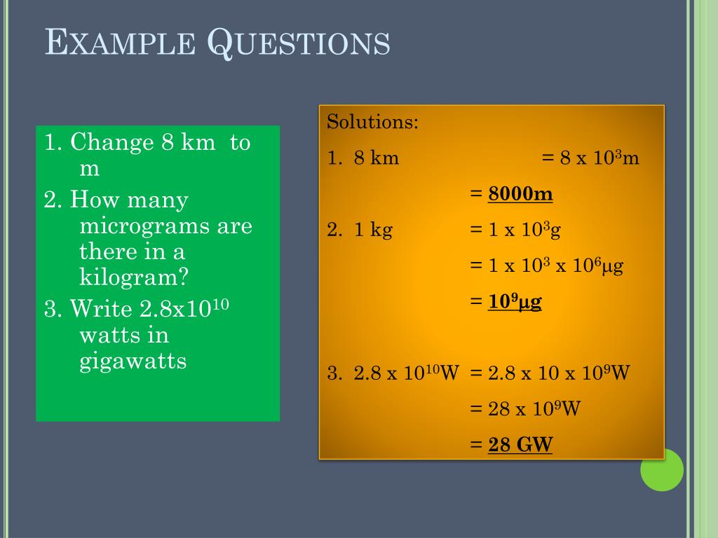 Example Questions • Solutions: • 8 km = 8 x 103m • = 8000m • 1 kg = 1 x 103g • = 1 x 103 x 106g • = 109g • 2.8 x 1010W = 2.8 x 10 x 109W • = 28 x 109W • = 28 GW 1. Change 8 km to m 2. How many micrograms are there in a kilogram? 3. Write 2.8x1010 watts in gigawatts
