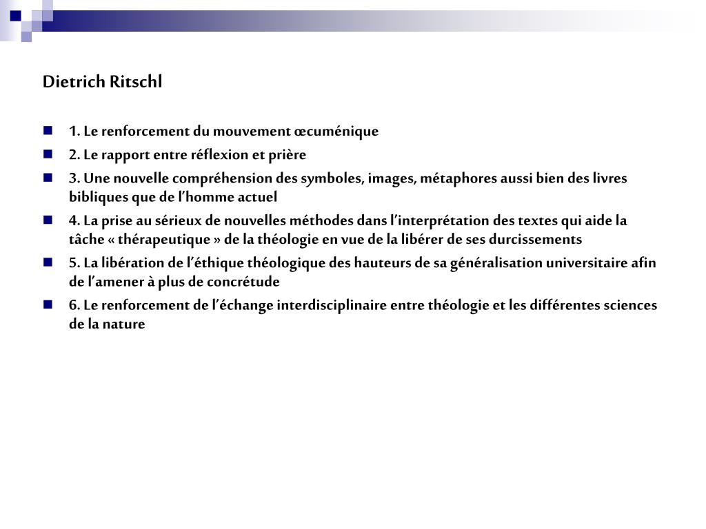 Dietrich Ritschl • 1. Le renforcement du mouvement œcuménique • 2. Le rapport entre réflexion et prière • 3. Une nouvelle compréhension des symboles, images, métaphores aussi bien des livres bibliques que de l’homme actuel • 4. La prise au sérieux de nouvelles méthodes dans l’interprétation des textes qui aide la tâche « thérapeutique » de la théologie en vue de la libérer de ses durcissements • 5. La libération de l’éthique théologique des hauteurs de sa généralisation universitaire afin de l’amener à plus de concrétude • 6. Le renforcement de l’échange interdisciplinaire entre théologie et les différentes sciences de la nature