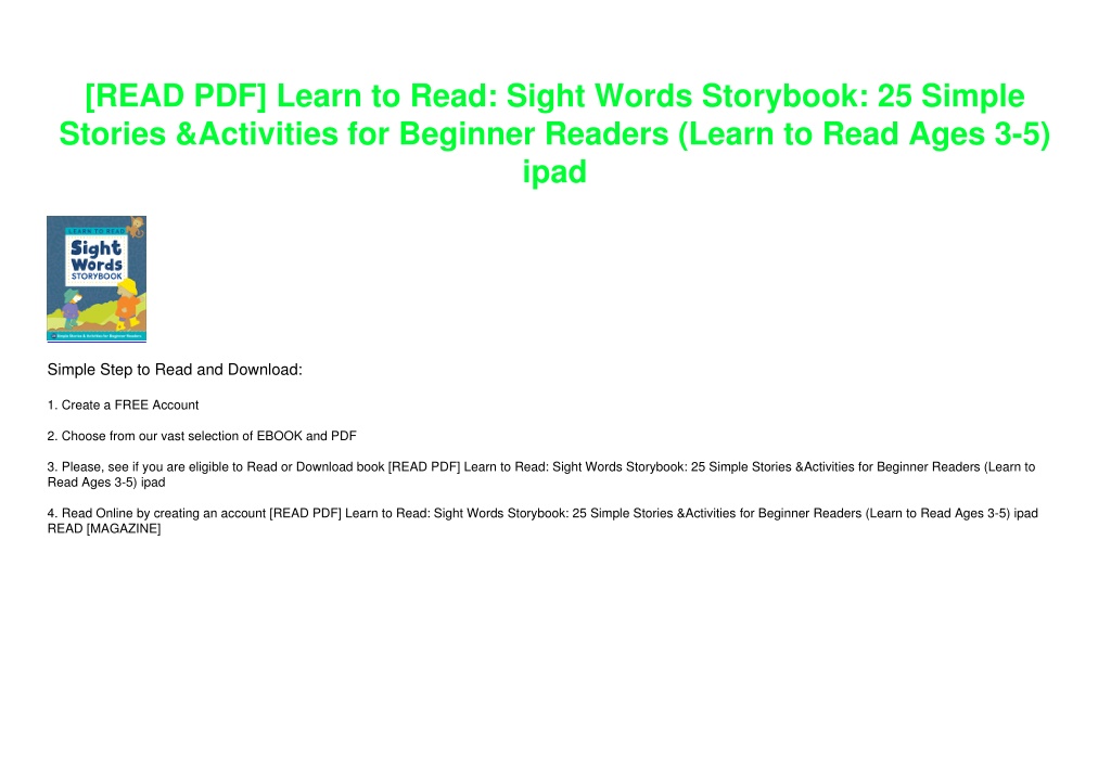 [READ PDF] Learn to Read: Sight Words Storybook: 25 Simple Stories &Activities for Beginner Readers (Learn to Read Ages 3-5) ipad Simple Step to Read and Download: 1. Create a FREE Account 2. Choose from our vast selection of EBOOK and PDF 3. Please, see if you are eligible to Read or Download book [READ PDF] Learn to Read: Sight Words Storybook: 25 Simple Stories &Activities for Beginner Readers (Learn to Read Ages 3-5) ipad 4. Read Online by creating an account [READ PDF] Learn to Read: Sight Words Storybook: 25 Simple Stories &Activities for Beginner Readers (Learn to Read Ages 3-5) ipad READ [MAGAZINE]