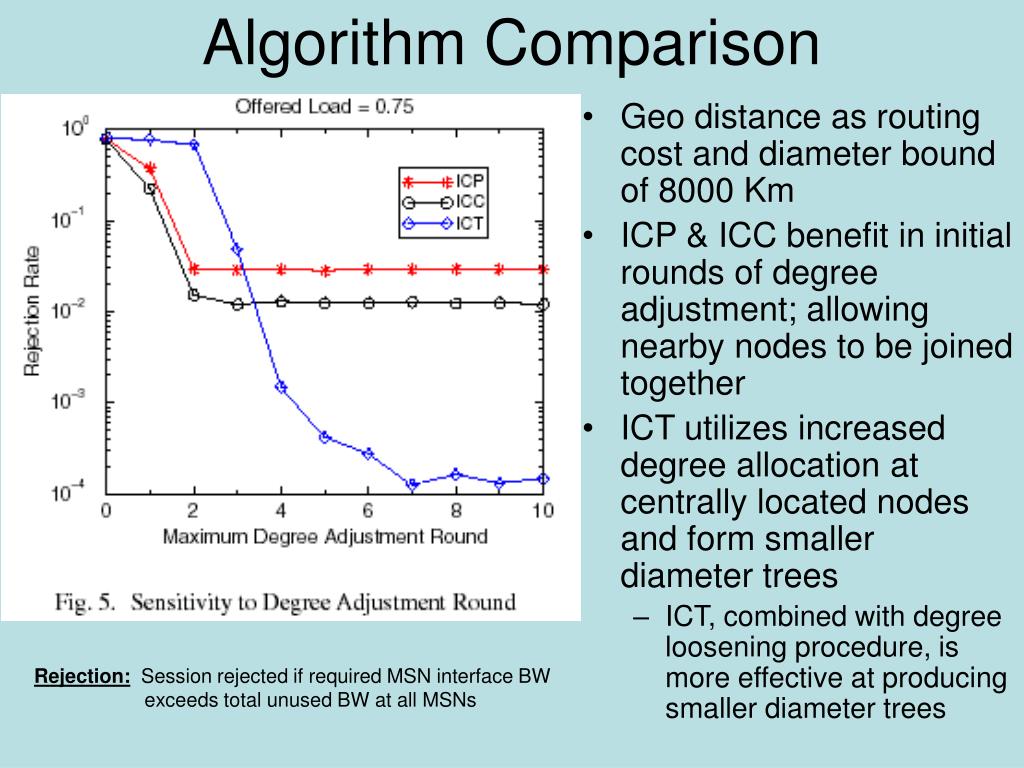 Algorithm Comparison • Geo distance as routing cost and diameter bound of 8000 Km • ICP & ICC benefit in initial rounds of degree adjustment; allowing nearby nodes to be joined together • ICT utilizes increased degree allocation at centrally located nodes and form smaller diameter trees • ICT, combined with degree loosening procedure, is more effective at producing smaller diameter trees Rejection: Session rejected if required MSN interface BW exceeds total unused BW at all MSNs