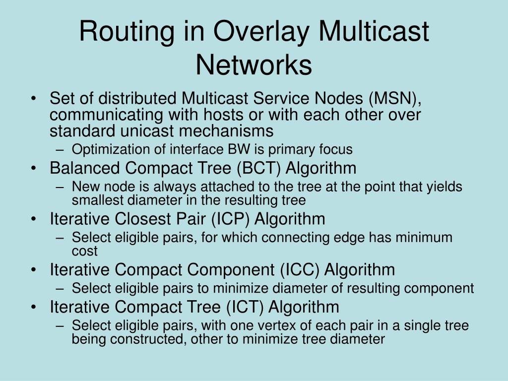 Routing in Overlay Multicast Networks • Set of distributed Multicast Service Nodes (MSN), communicating with hosts or with each other over standard unicast mechanisms • Optimization of interface BW is primary focus • Balanced Compact Tree (BCT) Algorithm • New node is always attached to the tree at the point that yields smallest diameter in the resulting tree • Iterative Closest Pair (ICP) Algorithm • Select eligible pairs, for which connecting edge has minimum cost • Iterative Compact Component (ICC) Algorithm • Select eligible pairs to minimize diameter of resulting component • Iterative Compact Tree (ICT) Algorithm • Select eligible pairs, with one vertex of each pair in a single tree being constructed, other to minimize tree diameter