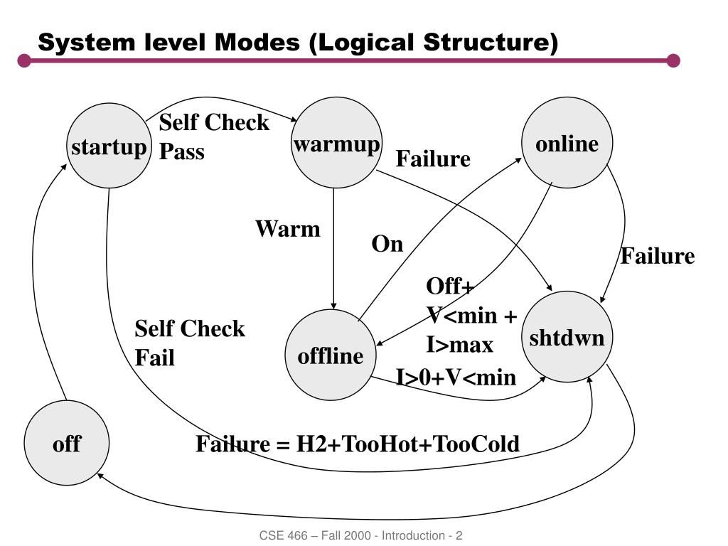 System level Modes (Logical Structure) warmup online startup Self Check Pass Failure Warm On Failure Off+ V<min + I>max shtdwn Self Check Fail offline I>0+V<min off Failure = H2+TooHot+TooCold CSE 466 – Fall 2000 - Introduction - 2