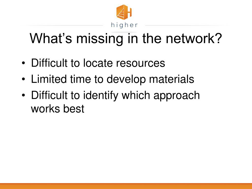 What’s missing in the network? • Difficult to locate resources • Limited time to develop materials • Difficult to identify which approach works best