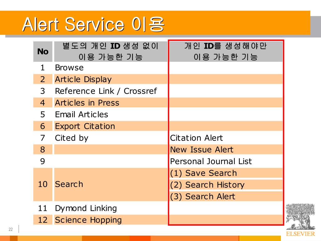 Alert – Save as Search Alert 저장된 검색 식에 대한 새로운 논문이 ScienceDirect에 등재될 때마다 알림 서비스 제공