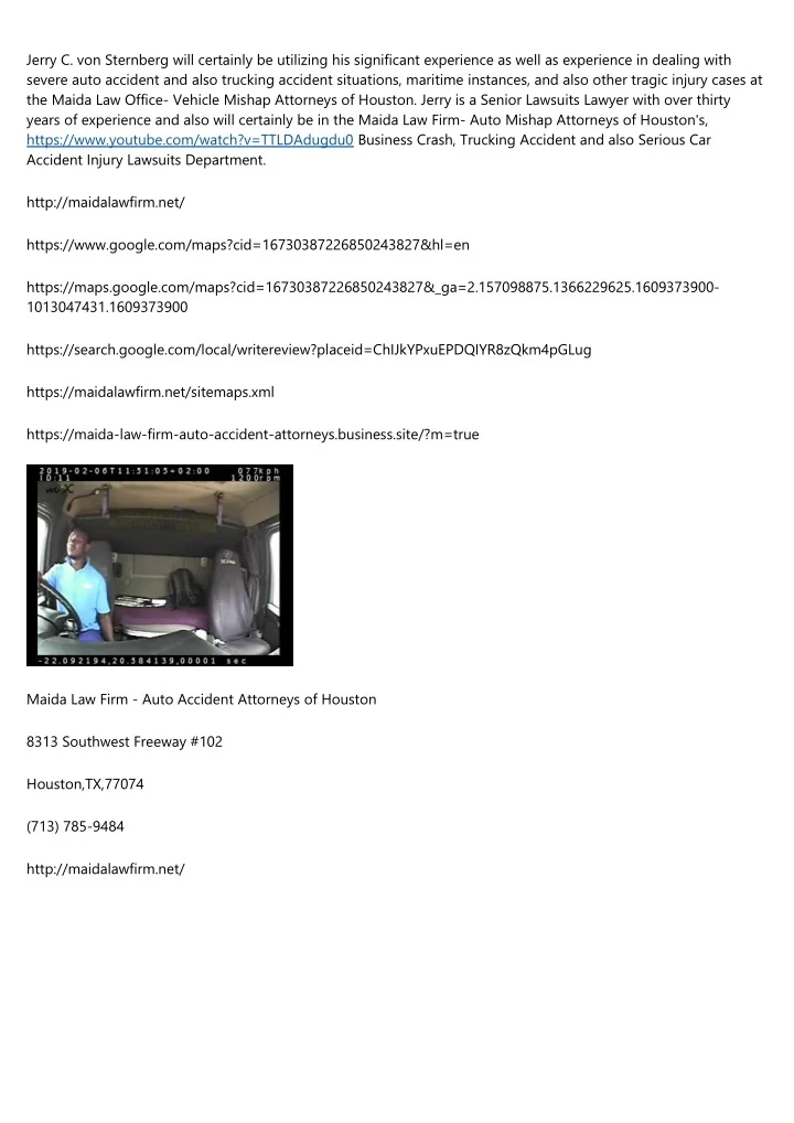 Jerry C. von Sternberg will certainly be utilizing his significant experience as well as experience in dealing with severe auto accident and also trucking accident situations, maritime instances, and also other tragic injury cases at the Maida Law Office- Vehicle Mishap Attorneys of Houston. Jerry is a Senior Lawsuits Lawyer with over thirty years of experience and also will certainly be in the Maida Law Firm- Auto Mishap Attorneys of Houston's, https://www.youtube.com/watch?v=TTLDAdugdu0 Business Crash, Trucking Accident and also Serious Car Accident Injury Lawsuits Department. http://maidalawfirm.net/ https://www.google.com/maps?cid=16730387226850243827&hl=en https://maps.google.com/maps?cid=16730387226850243827&_ga=2.157098875.1366229625.1609373900- 1013047431.1609373900 https://search.google.com/local/writereview?placeid=ChIJkYPxuEPDQIYR8zQkm4pGLug https://maidalawfirm.net/sitemaps.xml https://maida-law-firm-auto-accident-attorneys.business.site/?m=true Maida Law Firm - Auto Accident Attorneys of Houston 8313 Southwest Freeway #102 Houston,TX,77074 (713) 785-9484 http://maidalawfirm.net/