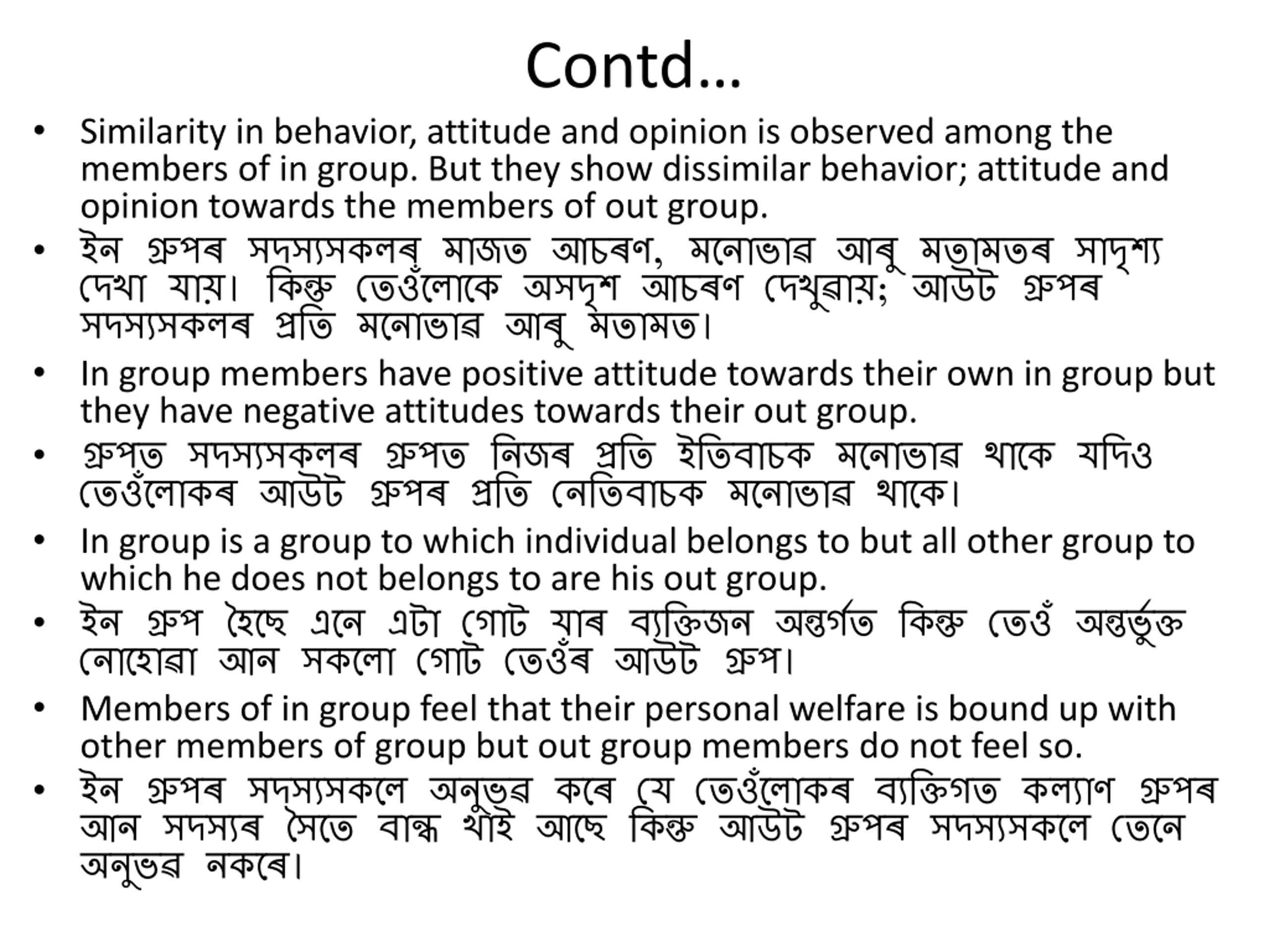 Contd… • Similarity in behavior, attitude and opinion is observed among the members of in group. But they show dissimilar behavior; attitude and opinion towards the members of out group. • ইন গ্ৰুপৰ সদসযসকলৰ মািত আচৰণ, মছনাভাৱ আৰু মতামতৰ সাদৃশয গদখা িা়ে। জকন্তু গতওঁছলাছক অসদৃশ আচৰণ গদখুৱা়ে; আউট গ্ৰুপৰ সদসযসকলৰ প্ৰজত মছনাভাৱ আৰু মতামত। • In group members have positive attitude towards their own in group but they have negative attitudes towards their out group. • গ্ৰুপত সদসযসকলৰ গ্ৰুপত জনিৰ প্ৰজত ইজতবাচক মছনাভাৱ থাছক িজদও গতওঁছলাকৰ আউট গ্ৰুপৰ প্ৰজত গনজতবাচক মছনাভাৱ থাছক। • In group is a group to which individual belongs to but all other group to which he does not belongs to are his out group. • ইন গ্ৰুপ হৈছে এছন এটা গ াট িাৰ বযজিিন অন্ত ্ত জকন্তু গতওঁ অন্তভু্ি গনাছৈাৱা আন সকছলা গ াট গতওঁৰ আউট গ্ৰুপ। • Members of in group feel that their personal welfare is bound up with other members of group but out group members do not feel so. • ইন গ্ৰুপৰ সদসযসকছল অনুভৱ কছৰ গি গতওঁছলাকৰ বযজি ত কলযাণ গ্ৰুপৰ আন সদসযৰ হসছত বান্ন খাই আছে জকন্তু আউট গ্ৰুপৰ সদসযসকছল গতছন অনুভৱ নকছৰ।