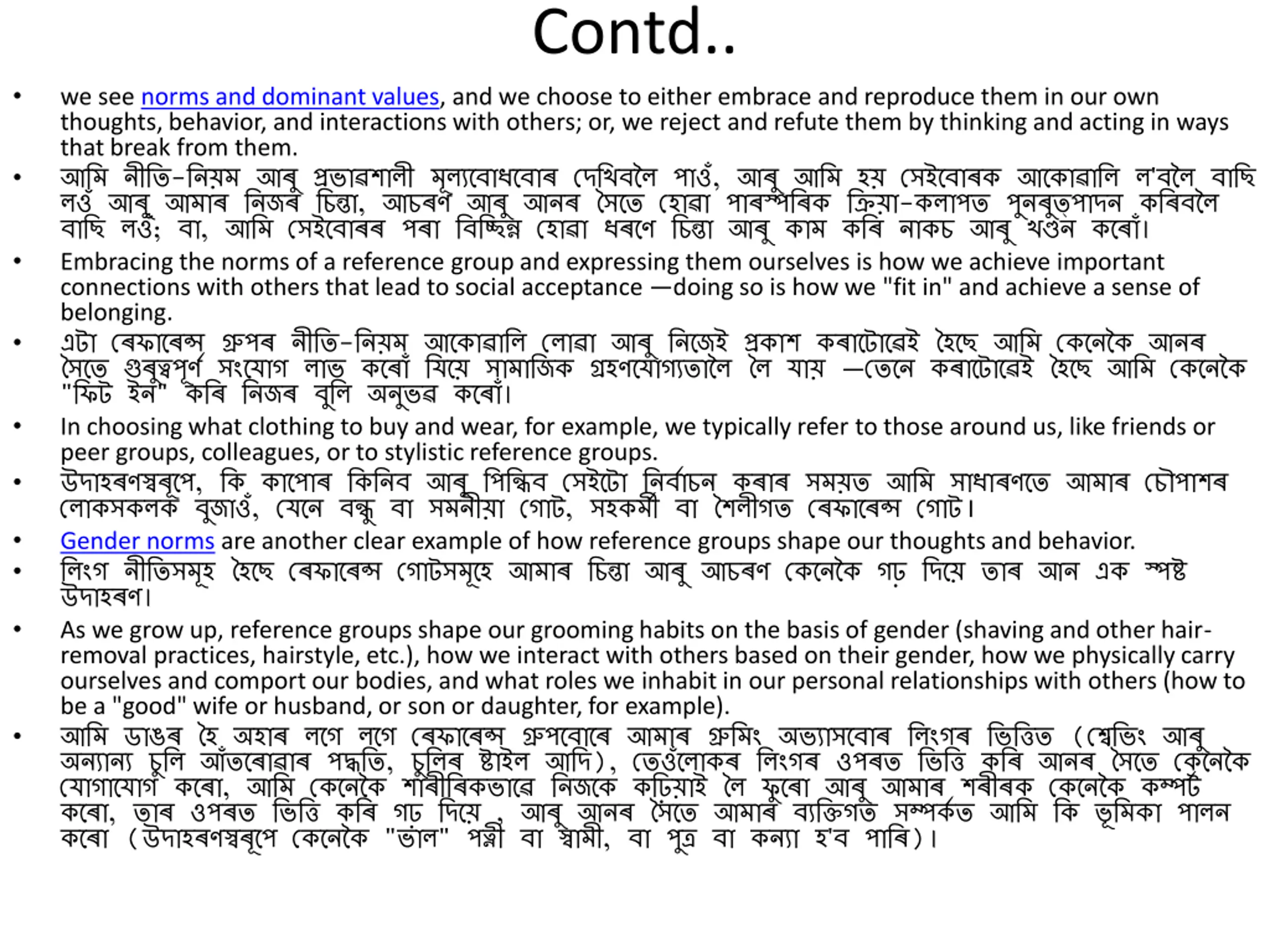Contd.. • we see norms and dominant values, and we choose to either embrace and reproduce them in our own thoughts, behavior, and interactions with others; or, we reject and refute them by thinking and acting in ways that break from them. আজম নীজত-জন়েম আৰু প্ৰভাৱশালী মূলযছবািছবাৰ গদজখবকল পাওঁ, আৰু আজম ৈ়ে গসইছবাৰক আছকাৱাজল ল'বকল বাজে লওঁ আৰু আমাৰ জনিৰ জচন্তা, আচৰণ আৰু আনৰ হসছত গৈাৱা পাৰস্পৰজৰক জি়ো-কলাপত পুনৰুত্পাদন কজৰবকল বাজে লওঁ; বা, আজম গসইছবাৰৰ পৰা জবজিন্ গৈাৱা িৰছণ জচন্তা আৰু কাম কজৰ নাকচ আৰু খণ্ডন কছৰাঁ। Embracing the norms of a reference group and expressing them ourselves is how we achieve important connections with others that lead to social acceptance —doing so is how we "fit in" and achieve a sense of belonging. এটা গৰফাছৰন্স গ্ৰুপৰ নীজত-জন়েম আছকাৱাজল গলাৱা আৰু জনছিই প্ৰকাশ কৰাছটাছৱই হৈছে আজম গকছনকক আনৰ হসছত গুৰুত্বপূণ্ সংছিা লাভ কছৰাঁ জিছ়ে সামাজিক গ্ৰৈণছিা যতাকল হল িা়ে —গতছন কৰাছটাছৱই হৈছে আজম গকছনকক "জফট ইন" কজৰ জনিৰ বুজল অনুভৱ কছৰাঁ। In choosing what clothing to buy and wear, for example, we typically refer to those around us, like friends or peer groups, colleagues, or to stylistic reference groups. উদাৈৰণস্বৰূছপ, জক কাছপাৰ জকজনব আৰু জপজন্নব গসইছটা জনব্াচন কৰাৰ সম়েত আজম সািাৰণছত আমাৰ গচৌপাশৰ গলাকসকলক বুিাওঁ, গিছন বন্নু বা সমনী়ো গ াট, সৈকমী বা হশলী ত গৰফাছৰন্স গ াট I Gender norms are another clear example of how reference groups shape our thoughts and behavior. জলং নীজতসমূৈ হৈছে গৰফাছৰন্স গ াটসমূছৈ আমাৰ জচন্তা আৰু আচৰণ গকছনকক ঢ় জদছ়ে তাৰ আন এক স্পৰষ্ট্ উদাৈৰণ। As we grow up, reference groups shape our grooming habits on the basis of gender (shaving and other hair- removal practices, hairstyle, etc.), how we interact with others based on their gender, how we physically carry ourselves and comport our bodies, and what roles we inhabit in our personal relationships with others (how to be a "good" wife or husband, or son or daughter, for example). আজম ডাঙৰ হৈ অৈাৰ লছ লছ গৰফাছৰন্স গ্ৰুপছবাছৰ আমাৰ গ্ৰুজমং অভযাসছবাৰ জলং ৰ জভজত্তত (গশ্বজভং আৰু অনযানয চুজল আঁতছৰাৱাৰ পদ্ধজত, চুজলৰ ষ্ট্াইল আজদ), গতওঁছলাকৰ জলং ৰ ওপৰত জভজত্ত কজৰ আনৰ হসছত গকছনকক গিা াছিা কছৰা, আজম গকছনকক শাৰীজৰকভাছৱ জনিছক কজঢ়়োই হল ফুছৰা আৰু আমাৰ শৰীৰক গকছনকক কম্পট ্ কছৰা, তাৰ ওপৰত জভজত্ত কজৰ ঢ় জদছ়ে , আৰু আনৰ হসছত আমাৰ বযজি ত সম্পক্ত আজম জক ভূজমকা পালন কছৰা (উদাৈৰণস্বৰূছপ গকছনকক "ভাল" পত্নী বা স্বামী, বা পুি বা কনযা ৈ'ব পাজৰ)। • • • • • • • • •