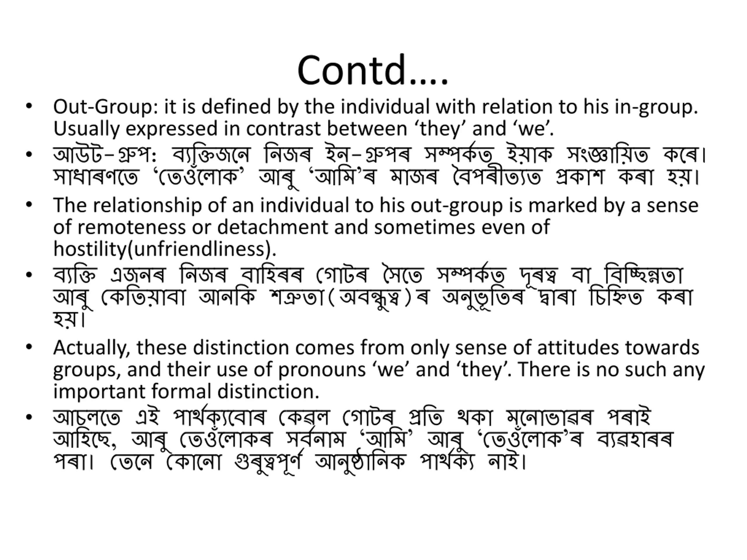 Contd…. • Out-Group: it is defined by the individual with relation to his in-group. Usually expressed in contrast between ‘they’ and ‘we’. • আউট-গ্ৰুপ: বযজিিছন জনিৰ ইন-গ্ৰুপৰ সম্পক্ত ই়োক সংজ্ঞাজ়েত কছৰ। সািাৰণছত ‘গতওঁছলাক’ আৰু ‘আজম’ৰ মািৰ হবপৰীতযত প্ৰকাশ কৰা ৈ়ে। • The relationship of an individual to his out-group is marked by a sense of remoteness or detachment and sometimes even of hostility(unfriendliness). • বযজি এিনৰ জনিৰ বাজৈৰৰ গ াটৰ হসছত সম্পক্ত দূৰত্ব বা জবজিন্তা আৰু গকজত়োবা আনজক শত্ৰুতা(অবন্নুত্ব)ৰ অনুভূজতৰ দ্বাৰা জচজিত কৰা ৈ়ে। • Actually, these distinction comes from only sense of attitudes towards groups, and their use of pronouns ‘we’ and ‘they’. There is no such any important formal distinction. • আচলছত এই পাথ্কযছবাৰ গকৱল গ াটৰ প্ৰজত থকা মছনাভাৱৰ পৰাই আজৈছে, আৰু গতওঁছলাকৰ সব্নাম ‘আজম’ আৰু ‘গতওঁছলাক’ৰ বযৱৈাৰৰ পৰা। গতছন গকাছনা গুৰুত্বপূণ্ আনুষ্ঠাজনক পাথ্কয নাই।