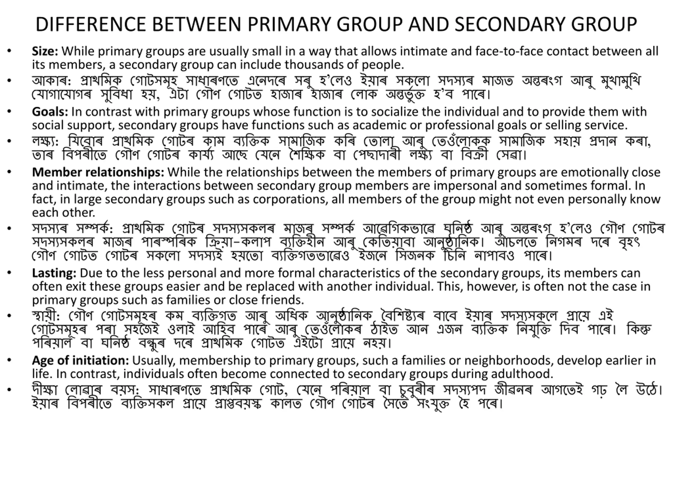 DIFFERENCE BETWEEN PRIMARY GROUP AND SECONDARY GROUP • Size: While primary groups are usually small in a way that allows intimate and face-to-face contact between all its members, a secondary group can include thousands of people. আকাৰ: প্ৰাথজমক গ াটসমূৈ সািাৰণছত এছনদছৰ সৰু ৈ’গলও ই়োৰ সকছলা সদসযৰ মািত অন্তৰং আৰু মুখামুজখ গিা াছিা ৰ সুজবিা ৈ়ে, এটা গ ৌণ গ াটত ৈািাৰ ৈািাৰ গলাক অন্তভু্ি ৈ’ব পাছৰ। Goals: In contrast with primary groups whose function is to socialize the individual and to provide them with social support, secondary groups have functions such as academic or professional goals or selling service. লক্ষয: জিছবাৰ প্ৰাথজমক গ াটৰ কাম বযজিক সামাজিক কজৰ গতালা আৰু গতওঁছলাকক সামাজিক সৈা়ে প্ৰদান কৰা, তাৰ জবপৰীছত গ ৌণ গ াটৰ কাি্য আছে গিছন হশজক্ষক বা গপোদাৰী লক্ষয বা জবিী গসৱা। Member relationships: While the relationships between the members of primary groups are emotionally close and intimate, the interactions between secondary group members are impersonal and sometimes formal. In fact, in large secondary groups such as corporations, all members of the group might not even personally know each other. সদসযৰ সম্পক্: প্ৰাথজমক গ াটৰ সদসযসকলৰ মািৰ সম্পক্ আছৱজ কভাছৱ ঘজনষ্ঠ আৰু অন্তৰং ৈ’গলও গ ৌণ গ াটৰ সদসযসকলৰ মািৰ পাৰস্পৰজৰক জি়ো-কলাপ বযজিৈীন আৰু গকজত়োবা আনুষ্ঠাজনক। আচলছত জন মৰ দছৰ বৃৈৎ গ ৌণ গ াটত গ াটৰ সকছলা সদসযই ৈ়েছতা বযজি তভাছৱও ইিছন জসিনক জচজন নাপাবও পাছৰ। Lasting: Due to the less personal and more formal characteristics of the secondary groups, its members can often exit these groups easier and be replaced with another individual. This, however, is often not the case in primary groups such as families or close friends. স্দা়েী: গ ৌণ গ াটসমূৈৰ কম বযজি ত আৰু অজিক আনুষ্ঠাজনক হবজশষ্ট্যৰ বাছব ই়োৰ সদসযসকছল প্ৰাছ়ে এই গ াটসমূৈৰ পৰা সৈছিই ওলাই আজৈব পাছৰ আৰু গতওঁছলাকৰ ঠাইত আন এিন বযজিক জনিুজি জদব পাছৰ। জকন্তু পজৰ়োল বা ঘজনষ্ঠ বন্নুৰ দছৰ প্ৰাথজমক গ াটত এইছটা প্ৰাছ়ে নৈ়ে। Age of initiation: Usually, membership to primary groups, such a families or neighborhoods, develop earlier in life. In contrast, individuals often become connected to secondary groups during adulthood. দীক্ষা গলাৱাৰ ব়েস: সািাৰণছত প্ৰাথজমক গ াট, গিছন পজৰ়োল বা চুবুৰীৰ সদসযপদ িীৱনৰ আ ছতই ঢ় হল উছঠ। ই়োৰ জবপৰীছত বযজিসকল প্ৰাছ়ে প্ৰাপ্তব়েস্ক কালত গ ৌণ গ াটৰ হসছত সংিুি হৈ পছৰ। • • • • • • • • •