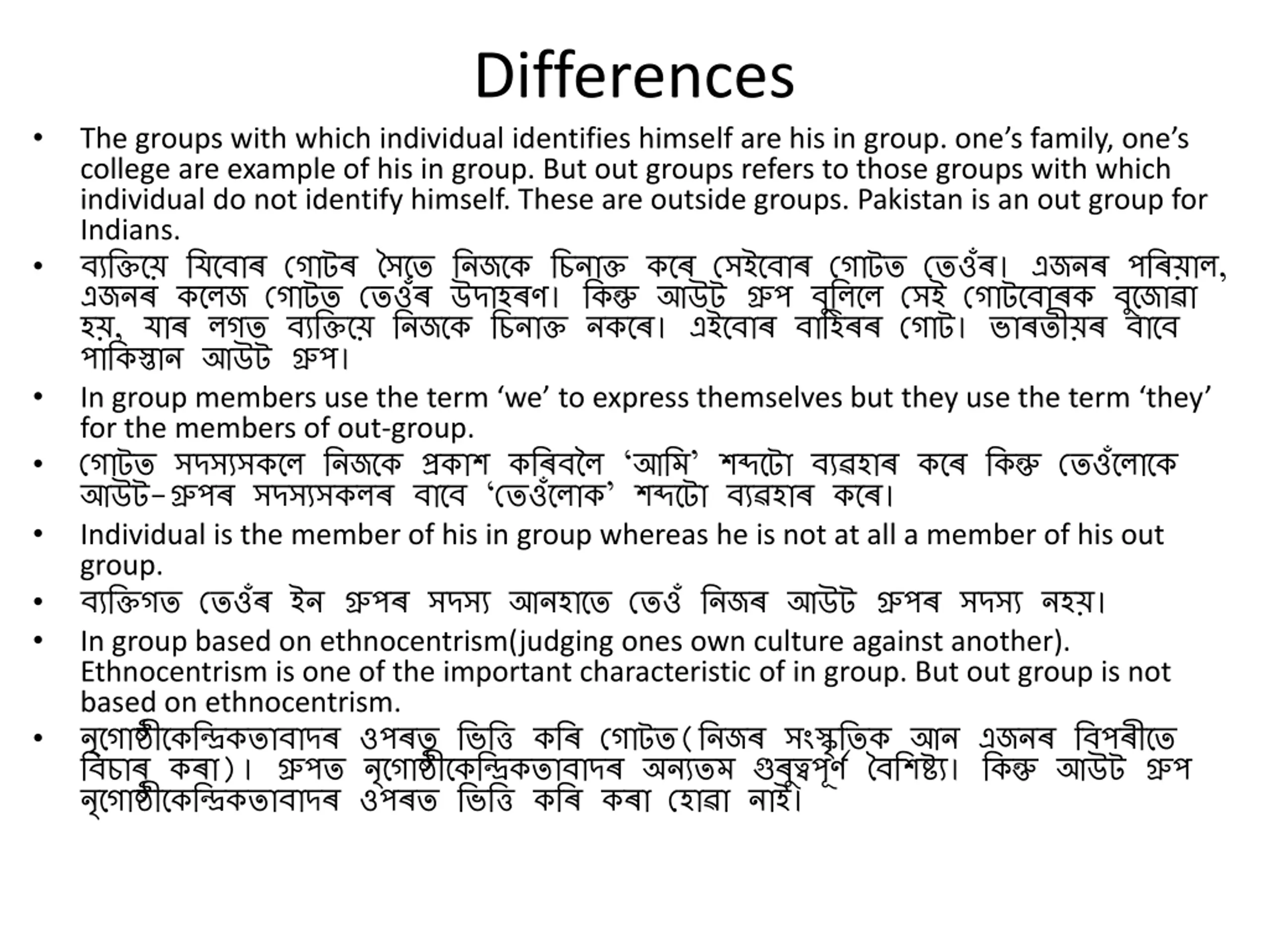 Differences • The groups with which individual identifies himself are his in group. one’s family, one’s college are example of his in group. But out groups refers to those groups with which individual do not identify himself. These are outside groups. Pakistan is an out group for Indians. বযজিছ়ে জিছবাৰ গ াটৰ হসছত জনিছক জচনাি কছৰ গসইছবাৰ গ াটত গতওঁৰ। এিনৰ পজৰ়োল, এিনৰ কছলি গ াটত গতওঁৰ উদাৈৰণ। জকন্তু আউট গ্ৰুপ বুজলছল গসই গ াটছবাৰক বুছিাৱা ৈ়ে, িাৰ ল ত বযজিছ়ে জনিছক জচনাি নকছৰ। এইছবাৰ বাজৈৰৰ গ াট। ভাৰতী়েৰ বাছব পাজকস্থান আউট গ্ৰুপ। In group members use the term ‘we’ to express themselves but they use the term ‘they’ for the members of out-group. গ াটত সদসযসকছল জনিছক প্ৰকাশ কজৰবকল ‘আজম’ শব্দছটা বযৱৈাৰ কছৰ জকন্তু গতওঁছলাছক আউট-গ্ৰুপৰ সদসযসকলৰ বাছব ‘গতওঁছলাক’ শব্দছটা বযৱৈাৰ কছৰ। Individual is the member of his in group whereas he is not at all a member of his out group. বযজি ত গতওঁৰ ইন গ্ৰুপৰ সদসয আনৈাছত গতওঁ জনিৰ আউট গ্ৰুপৰ সদসয নৈ়ে। In group based on ethnocentrism(judging ones own culture against another). Ethnocentrism is one of the important characteristic of in group. But out group is not based on ethnocentrism. নৃছ াষ্ঠীছকজিকতাবাদৰ ওপৰত জভজত্ত কজৰ গ াটত(জনিৰ সংস্কৃজতক আন এিনৰ জবপৰীছত জবচাৰ কৰা)। গ্ৰুপত নৃছ াষ্ঠীছকজিকতাবাদৰ অনযতম গুৰুত্বপূণ্ হবজশষ্ট্য। জকন্তু আউট গ্ৰুপ নৃছ াষ্ঠীছকজিকতাবাদৰ ওপৰত জভজত্ত কজৰ কৰা গৈাৱা নাই। • • • • • • •