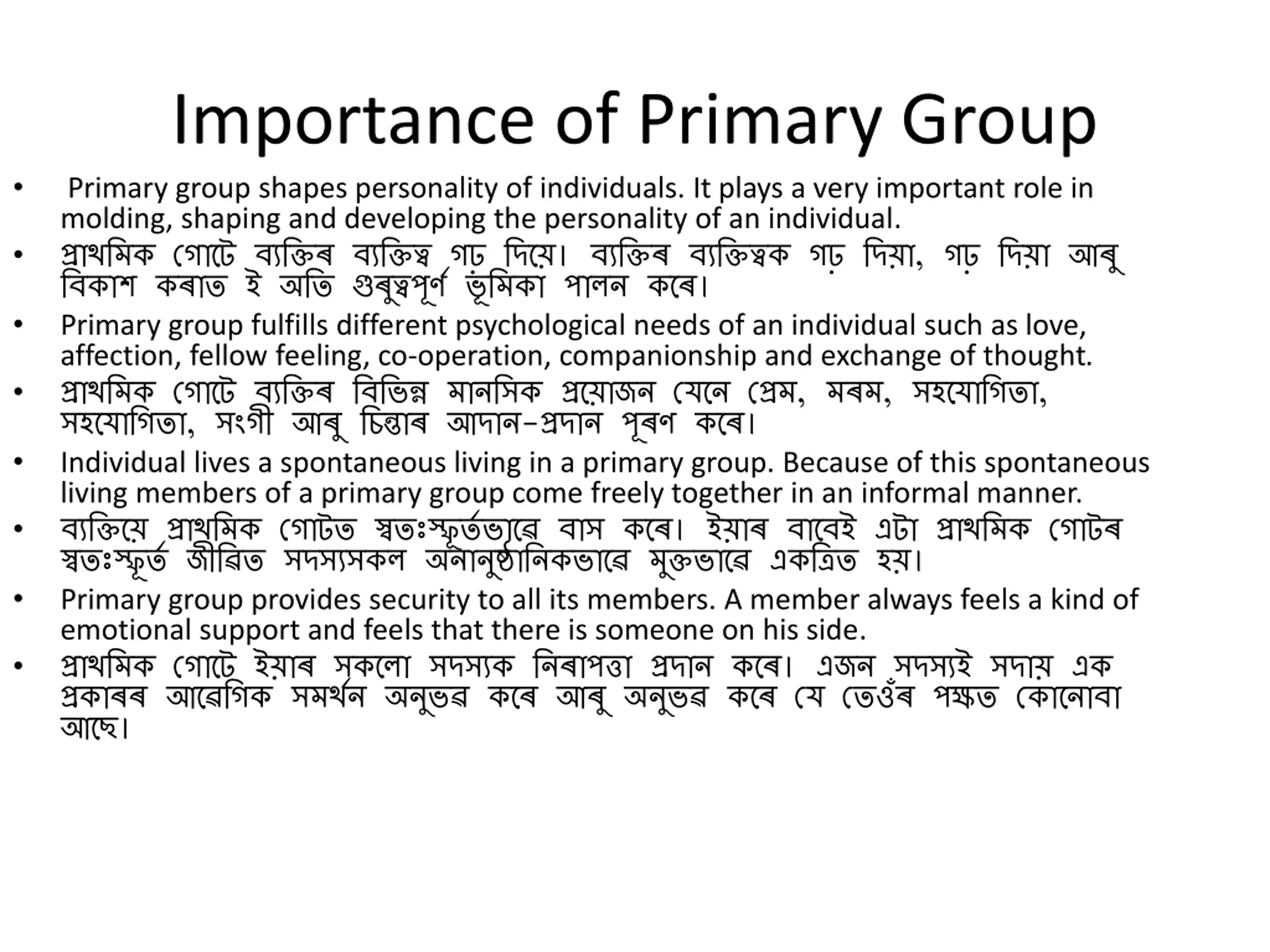 Importance of Primary Group Primary group shapes personality of individuals. It plays a very important role in molding, shaping and developing the personality of an individual. প্ৰাথজমক গ াছট বযজিৰ বযজিত্ব ঢ় জদছ়ে। বযজিৰ বযজিত্বক ঢ় জদ়ো, ঢ় জদ়ো আৰু জবকাশ কৰাত ই অজত গুৰুত্বপূণ্ ভূজমকা পালন কছৰ। Primary group fulfills different psychological needs of an individual such as love, affection, fellow feeling, co-operation, companionship and exchange of thought. প্ৰাথজমক গ াছট বযজিৰ জবজভন্ মানজসক প্ৰছ়োিন গিছন গপ্ৰম, মৰম, সৈছিাজ তা, সৈছিাজ তা, সং ী আৰু জচন্তাৰ আদান-প্ৰদান পূৰণ কছৰ। Individual lives a spontaneous living in a primary group. Because of this spontaneous living members of a primary group come freely together in an informal manner. বযজিছ়ে প্ৰাথজমক গ াটত স্বতঃস্ফূত্ভাছৱ বাস কছৰ। ই়োৰ বাছবই এটা প্ৰাথজমক গ াটৰ স্বতঃস্ফূত্ িীজৱত সদসযসকল অনানুষ্ঠাজনকভাছৱ মুিভাছৱ একজিত ৈ়ে। Primary group provides security to all its members. A member always feels a kind of emotional support and feels that there is someone on his side. প্ৰাথজমক গ াছট ই়োৰ সকছলা সদসযক জনৰাপত্তা প্ৰদান কছৰ। এিন সদসযই সদা়ে এক প্ৰকাৰৰ আছৱজ ক সমথ্ন অনুভৱ কছৰ আৰু অনুভৱ কছৰ গি গতওঁৰ পক্ষত গকাছনাবা আছে। • • • • • • • •