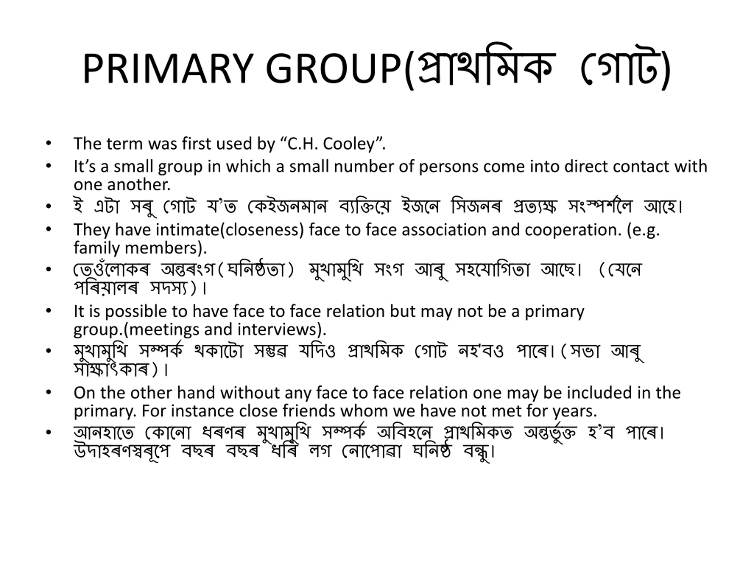 Characteristics of primary group প্ৰাথজমক গ াটৰ হবজশষ্ট্য • Its small in size due to which, in such group members cooperation, sympathy can be seen. • ই়োৰ আকাৰত সৰু িাৰ বাছব, এছন গ াটৰ সদসযসকলৰ সৈছিাজ তাত, সৈানুভূজত গদখা িা়ে। • Close identification can be seen which means direct cooperation I.e. doing the same thing together to achieve their common interest. • ঘজনষ্ঠ জচনািকৰণ গদখা িা়ে িাৰ অথ্ হৈছে প্ৰতযক্ষ সৈছিাজ তা গতওঁছলাকৰ উকমৈতী়ো স্বাথ্ লাভ কজৰবকল এছকলছ এছক কাম কজৰ আছে। • It has common aims and interest.(common religious believes). • ই়োৰ উকমৈতী়ো উছেশয আৰু আগ্ৰৈ আছে।(এছকিৰণৰ িমী়ে জবশ্বাস)। • The relation among the members are spontaneous not a pressurized relationship. • সদসযসকলৰ মািৰ সম্পক্ছবাৰ স্বতস্ফূত্ নৈ়ে, গৈঁচা প্ৰছ়ো কৰা সম্পক্ নৈ়ে।