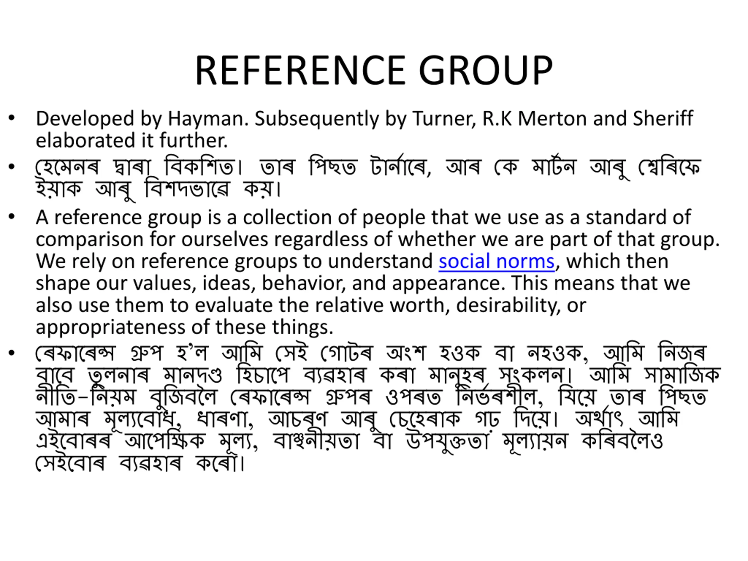 REFERENCE GROUP • Developed by Hayman. Subsequently by Turner, R.K Merton and Sheriff elaborated it further. • গৈছমনৰ দ্বাৰা জবকজশত। তাৰ জপেত টান্াছৰ, আৰ গক মাট ্ ন আৰু গশ্বজৰছফ ই়োক আৰু জবশদভাছৱ ক়ে। • A reference group is a collection of people that we use as a standard of comparison for ourselves regardless of whether we are part of that group. We rely on reference groups to understand social norms, which then shape our values, ideas, behavior, and appearance. This means that we also use them to evaluate the relative worth, desirability, or appropriateness of these things. • গৰফাছৰন্স গ্ৰুপ ৈ’ল আজম গসই গ াটৰ অংশ ৈওক বা নৈওক, আজম জনিৰ বাছব তুলনাৰ মানদণ্ড জৈচাছপ বযৱৈাৰ কৰা মানুৈৰ সংকলন। আজম সামাজিক নীজত-জন়েম বুজিবকল গৰফাছৰন্স গ্ৰুপৰ ওপৰত জনভ্ৰশীল, জিছ়ে তাৰ জপেত আমাৰ মূলযছবাি, িাৰণা, আচৰণ আৰু গচছৈৰাক ঢ় জদছ়ে। অথ্াৎ আজম এইছবাৰৰ আছপজক্ষক মূলয, বাঞ্ছনী়েতা বা উপিুিতা মূলযা়েন কজৰবকলও গসইছবাৰ বযৱৈাৰ কছৰা।
