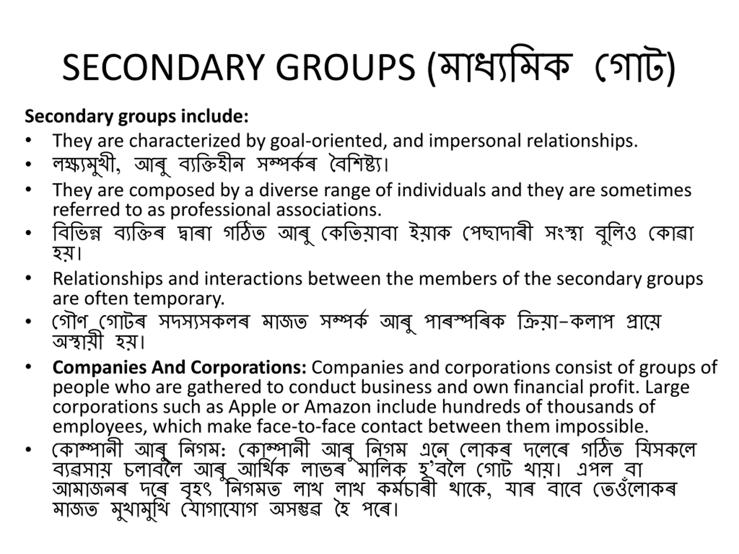 SECONDARY GROUPS (মািযজমক গ াট) Secondary groups include: • They are characterized by goal-oriented, and impersonal relationships. • লক্ষযমুখী, আৰু বযজিৈীন সম্পক্ৰ হবজশষ্ট্য। • They are composed by a diverse range of individuals and they are sometimes referred to as professional associations. • জবজভন্ বযজিৰ দ্বাৰা ঠিত আৰু গকজত়োবা ই়োক গপোদাৰী সংস্দা বুজলও গকাৱা ৈ়ে। • Relationships and interactions between the members of the secondary groups are often temporary. • গ ৌণ গ াটৰ সদসযসকলৰ মািত সম্পক্ আৰু পাৰস্পৰজৰক জি়ো-কলাপ প্ৰাছ়ে অস্দা়েী ৈ়ে। • Companies And Corporations: Companies and corporations consist of groups of people who are gathered to conduct business and own financial profit. Large corporations such as Apple or Amazon include hundreds of thousands of employees, which make face-to-face contact between them impossible. • গকাম্পানী আৰু জন ম: গকাম্পানী আৰু জন ম এছন গলাকৰ দছলছৰ ঠিত জিসকছল বযৱসা়ে চলাবকল আৰু আজথ্ক লাভৰ মাজলক ৈ’বকল গ াট খা়ে। এপল বা আমািনৰ দছৰ বৃৈৎ জন মত লাখ লাখ কম্চাৰী থাছক, িাৰ বাছব গতওঁছলাকৰ মািত মুখামুজখ গিা াছিা অসম্ভৱ হৈ পছৰ।