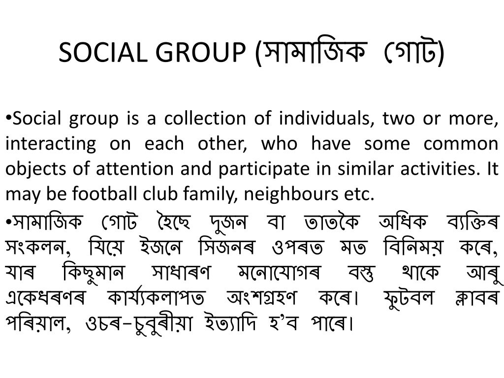 SOCIAL GROUP (সামাজিক গ াট) •Social group is a collection of individuals, two or more, interacting on each other, who have some common objects of attention and participate in similar activities. It may be football club family, neighbours etc. •সামাজিক গ াট হৈছে দুিন সংকলন, জিছ়ে ইিছন জসিনৰ ওপৰত মত জবজনম়ে কছৰ, িাৰ জকেুমান সািাৰণ মছনাছিা ৰ এছকিৰণৰ কাি্যকলাপত অংশগ্ৰৈণ পজৰ়োল, ওচৰ-চুবুৰী়ো ইতযাজদ ৈ’ব পাছৰ। বা তাতকক অজিক বযজিৰ বস্তু থাছক ফুটবল আৰু ক্লাবৰ কছৰ।
