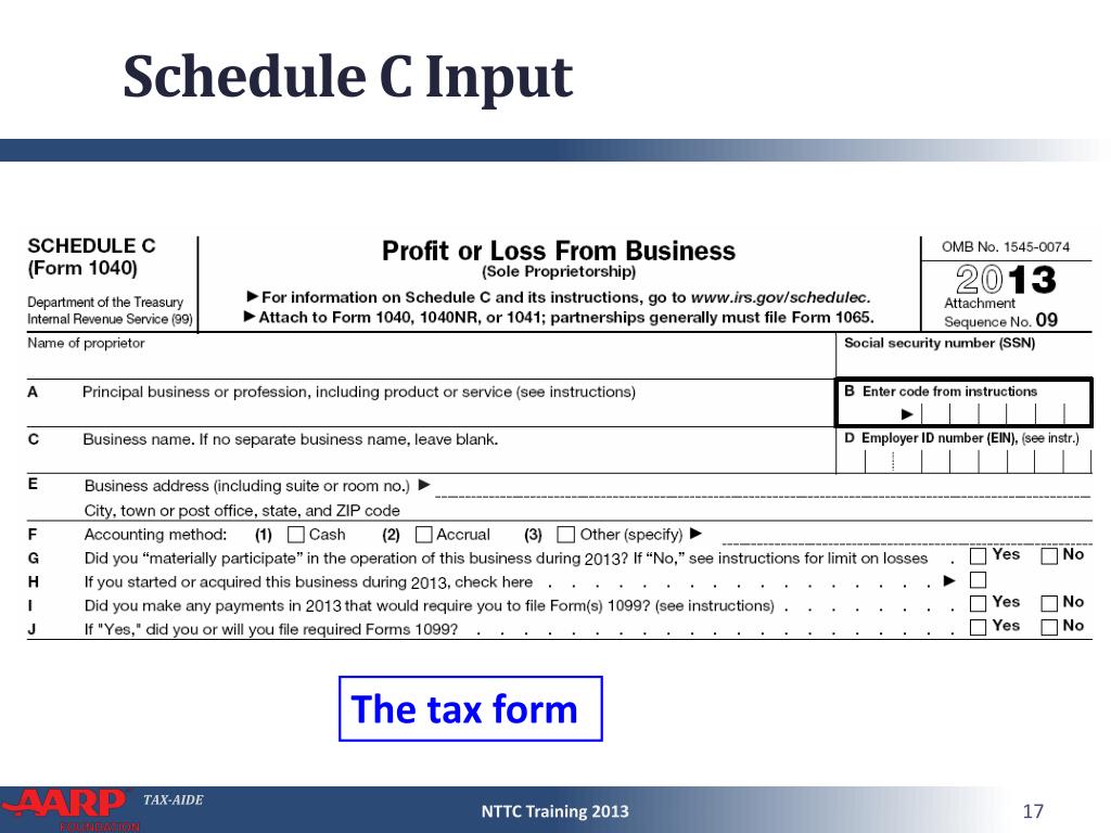 Schedule C Input • Use Schedule C (do not use Schedule C-EZ) • Must be for either Taxpayer or Spouse • Jointly run business must be split into two Schedules C • Self employment tax implications NTTC Training 2013