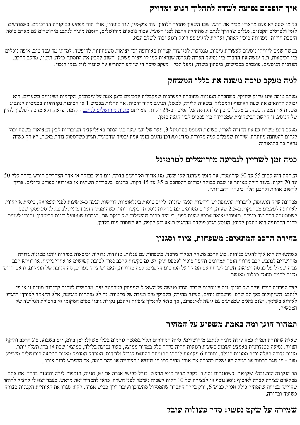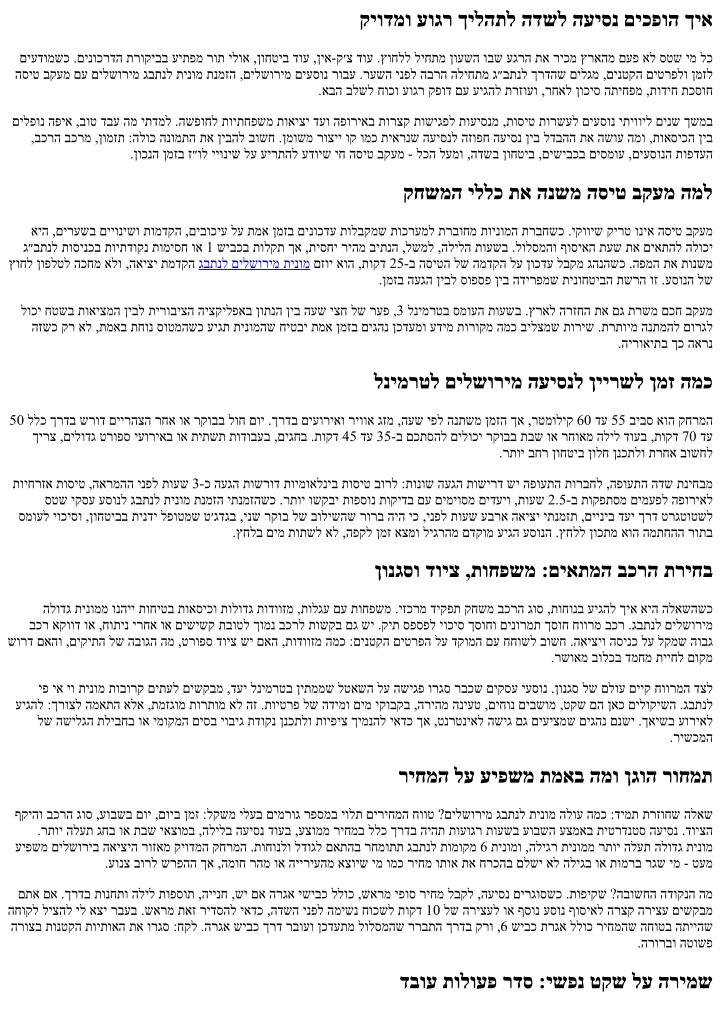 תוחיטבו תונוישיר ,חוטיב שיש ,םיעסונ תעסהל השרומ בכרהש ואדו .ריינ תכיתח אל איה תוחיטב לבא .ילמרופה דצה לע םיבשוח תוחפ ,רוחאמ םיבשויו הדווזמ םימירמשכ תורוגח ,ןיעל תיארנ הקוזחת ,יבקע ןפואב יקנ בכר :םינטק םינמיס ושפח .עקר תוקידב ורבעש םיגהנ םע תדבוע תועסהה תרבחשו ,םיאתמ חוטיב ,ןגזמ ליעפהל םא לאשיו ,םכלש תוחונה לובגל רבעמ רהמי אל יעוצקמ גהנ .םידלי שי םא םיינקת תוחיטב תואסיכו ,םיבשומה לכב תוניקת תוחיטב .תוכיא שורדל יאדכ ליגר תורישב םג לבא ,תינבומ העיגמ וזה השיגה ,VIP תינומב .טקש ריאשהל וא ,הקיזומ םיאירממש ירחא םירכוזש המ :חטשהמ תויווח לע שקעתה ןטקה דליהש דע ,קתקתה לכה .ישישל ישימח ןיבש הלילב גבתנל םילשורימ הלודג תינומ הנימזה השימח לש החפשמ הבש העיסנ רכוז רוזחל :ןורתפ עיצהו םירוהה םע םילמ רימה ,קלד תנחתב רצע גהנה .לגלגתמ יכב לש העש יצחב הלעת תחא הקד םימעפל .תיבב ראשנש ולש יבודה דליהו ,םיעוגר ועיגה םה ףוסב .לק בוכיע לע עירתהש הסיט בקעמו חותפ שיבכ תוכזב ןמזב עיגהל ןיידעו ,הסיטב טקש חיוורהל ,התיבה תוקד 7 .סוטמל היילעה ינפל םדרנ גהנה .םיל רבעמ חוקלה םע העוגר תינופלט החישו תויטרפ לע היה שגדה .תמדקומ רקוב תעשל גבתנל יפ יא יו תינומ ןימזה יקסע עסונ ,רחא הרקמב וא הדשה קר אל אוה ןורכיזב ראשנש המ םימעפל .םינכשל עירפהל אל ידכ ןיינבל טקש טולישו ,םימ קובקב ,בשומ ןוויכ ,הניעט שארמ אדיו .עסונה לש ךרוצה תא תדבכמש תקיודמ הנכה לש טקפא - םהילא ךרדה אלא ,סוטמה םיימעפ רוזחל ילב המכח הנמזה עצבל ךיא וא הסינכ דוק םע תטרופמ האיצי תבותכ ,תרעושמ התיחנו הארמה תעש ,קיודמה הסיטה רפסמ תא ונת .תודבועה ביבס תחסונמ הבוט הנמזה תחיש דצה תלד די לע תבשל םכל בושח םא .תאז ורמא ,שימג ןמז ןולח םייק םא .םיגירח םיטירפ יגוסו תודווזמה תומכ ,קיודמ םיעסונ רפסמ ,הינח תוארוה תדוקנ רידגהל יאדכ ,םיצופיש םע תונוכש וא םיקסע תריגס תועשב ריעה זכרמ ומכ ,םילשוריב םימיוסמ םירוזאב .תאז ונייצ ,םיוסמ בשומב וא .תיפיצפסה הסינכה לע שקעתהל םוקמב שארמ תמכסומ שגפמ תחא םעפמ רתוי יתיאר לבא ,ןטק טרפ הרואכל הז .ךיראת לובלב עונמל ידכ תוצח ירחא איה העשה םא ןכדעל וחכשת לא ,שארמ הליל ןימזמש ימל .הרצק ןמזה דגנ ץורמל ךרדה הפמו ,םדוקה םויל תועטב העבקנש 00:30-ל הנמזה תורישל טקש םיפיסומש םייגולונכט תונורתי תיטמוטוא העיגמש יושירו ,בכרה גוס ,גהנה םש םע SMS תעדוה .בכרל תונמזהה תכרעמ ןיב תוירושיקל יתועמשמ ךרע שי ,הסיט בקעמל רבעמ רשפא תומיוסמ תויצקילפאב .תואדו תשוחת תרציימו ,תורישי רשקתל ךרד תנתונ ,תויועט תענומ איה .תרתוימ תוחונ אל איה ףוסיאה ינפל העש .היצקילפא לע קר וכמסת לא ,תאז םע .תרכשומ הרידל חתפמ ריזחמ וא יבולב הכחמש ימל גונעת הז .ףוסיאה םוקמל בכרה תוברקתה רחא בוקעל .תועדוה תרשרשמ רתוי רהמ םירעפ רגוס ישונא לוק .ורשקתה ,קפס לש עגרב ךכ לכ םדקומ תאצל םיבייח דימת םאה רשפא ,סוטמה ןטבל הדווזמ םיחלוש םכניאו קודיבב זרוזמ לולסמ רשפאמש הובג סוטטסב סיטרכ םכל שי םא .ןמז רצקל רשפא ןהבש תויצאוטיס שי :יופצ תוחפ יכה טנמלאה תא חוכשל רוסא לבא .ןולחה תא טעמ קדהל רשפא ,רתוי עוגר הפועתה הדשו הלילב הסיטה םא .תוקד 30 דע 20 ךוסחל אלא ,ןמז זובזב אל אוה תוקד 25 דע 15 לש ןוחטיב חוורמ .איגה רעש תא םירבוע םתאש ינפל תוקד 15 תשחרתמש הנואת ןקתל רשפא יא .ךרדה .דימע חוטיב תקיודמה הריחבה אוה םיבשומ השישל בכר יתמ בוליש תקפסמ גבתנל תומוקמ 6 תינומ ,יתועמשמ דויצ םע םידלי ינשו םירגובמ השולש וא םישנא השיש דע השימח לש הנטק הצובקב רבודמשכ .ץחל םילעמש סירטט יקחשמ אלל דויצ סימעהלו ,בוט אל שיגרמש דלי לש הרקמב תומוקמ ףילחהל ,זוזל תרשפאמ איה .תוחונל תולע ןיב םיענ .בהז הווש שימגה םיבשומה רודיס ,ןכדעתמ טקיורפה להנמש ןמזב רוחאמ תויטרפב רבדל םיצור םיתימע ינששכ ,םיקסעל ןורחאה עגרה לש םייונישו תויחד םע תודדומתה םישנאש הנבהו ,תמא ןמזב םינוכדע ,השימג יוניש תוינידמ עיצמש תוריש .לדבהה תא השוע הז םע םידדומתמ ובש ןפואה .הרוק הז .תוחדנ תוסיט הדובע 