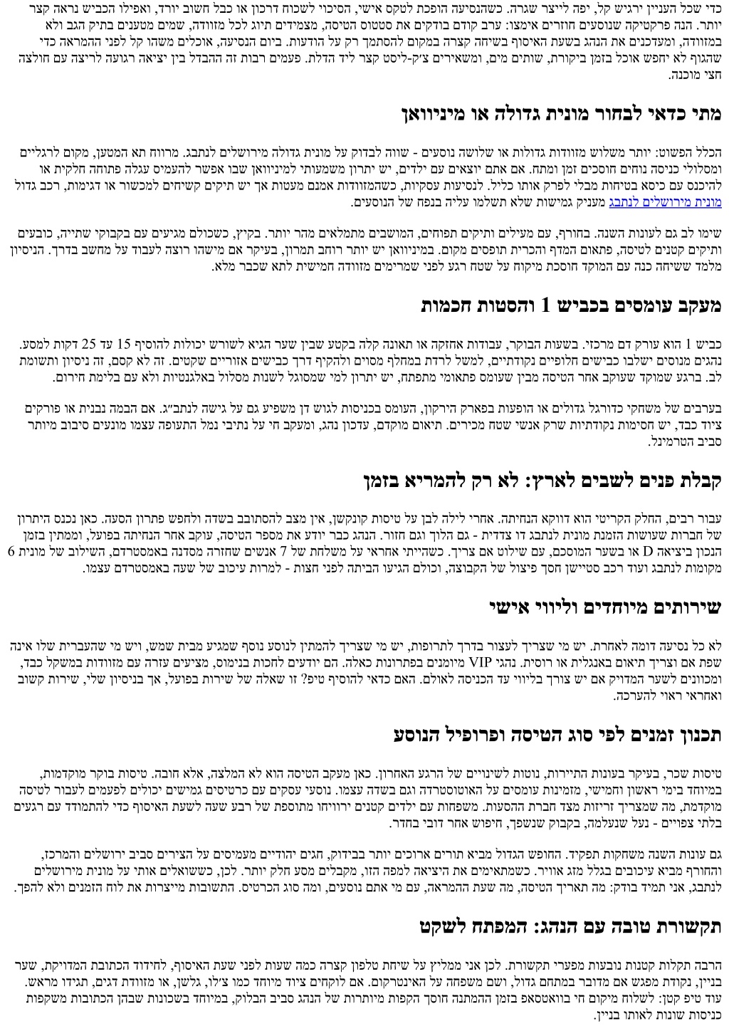 רצק הארנ שיבכה וליפאו ,דרוי בושח לבכ וא ןוכרד חוכשל יוכיסה ,ישיא סקטל תכפוה העיסנהשכ .הרגש רצייל הפי ,לק שיגרי ןיינעה לכש ידכ אלו בגה קיתב םינעטמ םימש ,הדווזמ לכל גוית םידימצמ ,הסיטה סוטטס תא םיקדוב םדוק ברע :וצמיא םירזוח םיעסונש הקיטקרפ הנה .רתוי ידכ הארמהה ינפל לק והשמ םילכוא ,העיסנה םויב .תועדוה לע קר ךמתסהל םוקמב הרצק החישב ףוסיאה תעשב גהנה תא םינכדעמו ,הדווזמב הצלוח םע הצירל העוגר האיצי ןיב לדבהה הז תובר םימעפ .תלדה דיל רצק טסיל-ק׳צ םיריאשמו ,םימ םיתוש ,תרוקיב ןמזב לכוא שפחי אל ףוגהש .הנכומ יצח ןאווינימ וא הלודג תינומ רוחבל יאדכ יתמ םיילגרל םוקמ ,ןעטמה את חוורמ .גבתנל םילשורימ הלודג תינומ לע קודבל הווש - םיעסונ השולש וא תולודג תודווזמ שולשמ רתוי :טושפה ללכה וא תיקלח החותפ הלגע סימעהל רשפא ובש ןאווינימל יתועמשמ ןורתי שי ,םידלי םע םיאצוי םתא םא .חתמו ןמז םיכסוח םיחונ הסינכ ילולסמו לודג בכר ,תומיגד וא רושכמל םיחישק םיקית שי ךא תוטעמ םנמא תודווזמהשכ ,תויקסע תועיסנל .לילכ ותוא קרפל ילבמ תוחיטב אסיכ םע סנכיהל .םיעסונה לש חפנב הילע ומלשת אלש תושימג קינעמ גבתנל םילשורימ תינומ םיעבוכ ,הייתש יקובקב םע םיעיגמ םלוכשכ ,ץיקב .רתוי רהמ םיאלמתמ םיבשומה ,םיחופת םיקיתו םיליעמ םע ,ףרוחב .הנשה תונועל םג בל ומיש ןויסינה .ךרדב בשחמ לע דובעל הצור והשימ םא רקיעב ,ןורמת בחור רתוי שי ןאווינימב .םוקמ םיספות תירכהו ףדמה םואתפ ,הסיטל םינטק םיקיתו .אלמ רבכש אתל תישימח הדווזמ םימירמש ינפל עגר חטש לע חוקימ תכסוח דקומה םע הנכ החישש דמלמ תומכח תוטסהו 1 שיבכב םיסמוע בקעמ .עסמל תוקד 25 דע 15 ףיסוהל תולוכי שרושל איגה רעש ןיבש עטקב הלק הנואת וא הקזחא תודובע ,רקובה תועשב .יזכרמ םד קרוע אוה 1 שיבכ תמושתו ןויסינ הז ,םסק אל הז .םיטקש םיירוזא םישיבכ ךרד ףיקהלו םיוסמ ףלחמב תדרל לשמל ,םייתדוקנ םייפולח םישיבכ ובלשי םיסונמ םיגהנ .םוריח תמילב םע אלו תויטנגלאב לולסמ תונשל לגוסמש ימל ןורתי שי ,חתפתמ ימואתפ סמועש ןיבמ הסיטה רחא בקועש דקומש עגרב .בל םיקרופ וא תינבנ המבה םא .ג״בתנל השיג לע םג עיפשמ ןד שוגל תוסינכב סמועה ,ןוקריה קראפב תועפוה וא םילודג לגרודכ יקחשמ לש םיברעב רתוימ בוביס םיענומ ומצע הפועתה למנ יביתנ לע יח בקעמו ,גהנ ןוכדע ,םדקומ םואית .םיריכמ חטש ישנא קרש תויתדוקנ תומיסח שי ,דבכ דויצ .לנימרטה ביבס ןמזב אירמהל קר אל :ץראל םיבשל םינפ תלבק ןורתיה סנכנ ןאכ .העסה ןורתפ שפחלו הדשב בבותסהל בצמ ןיא ,ןשקנוק תוסיט לע ןבל הליל ירחא .התיחנה אקווד אוה יטירקה קלחה ,םיבר רובע ןמזב ןיתממו ,לעופב התיחנה רחא בקוע ,הסיטה רפסמ תא עדוי רבכ גהנה .רוזח םגו ךולה םג - תידדצ וד גבתנל תינומ תנמזה תושועש תורבח לש 6 תינומ לש בולישה ,םדרטסמאב הנדסמ הרזחש םישנא 7 לש תחלשמ לע יארחא יתייהשכ .ךירצ םא טוליש םע ,םכסומה רעשב וא D האיציב ןוכנה .ומצע םדרטסמאב העש לש בוכיע תורמל - תוצח ינפל התיבה ועיגה םלוכו ,הצובקה לש לוציפ ךסח ןשייטס בכר דועו גבתנל תומוקמ ישיא יווילו םידחוימ םיתוריש הניא ולש תירבעהש ימ שיו ,שמש תיבמ עיגמש ףסונ עסונל ןיתמהל ךירצש ימ שי ,תופורתל ךרדב רוצעל ךירצש ימ שי .תרחאל המוד העיסנ לכ אל ,דבכ לקשמב תודווזמ םע הרזע םיעיצמ ,סומינב תוכחל םיעדוי םה .הלאכ תונורתפב םינמוימ VIP יגהנ .תיסור וא תילגנאב םואית ךירצו םא תפש בושק תוריש ,ילש ןויסינב ךא ,לעופב תוריש לש הלאש וז ?פיט ףיסוהל יאדכ םאה .םלואל הסינכה דע יווילב ךרוצ שי םא קיודמה רעשל םינווכמו .הכרעהל יואר יארחאו עסונה ליפורפו הסיטה גוס יפל םינמז ןונכת ,תומדקומ רקוב תוסיט .הבוח אלא ,הצלמה אל אוה הסיטה בקעמ ןאכ .ןורחאה עגרה לש םייונישל תוטונ ,תורייתה תונועב רקיעב ,רכש תוסיט הסיטל רובעל םימעפל םילוכי םישימג םיסיטרכ םע םיקסע יעסונ .ומצע הדשב םגו הדרטסוטואה לע םיסמוע תונימזמ ,ישימחו ןושאר ימיב דחוימב םיעגר םע דדומתהל ידכ ףוסיאה תעשל העש עבר לש תפסותמ וחיוורי םינטק םידלי םע תוחפשמ .תועסהה תרבח דצמ תוזי