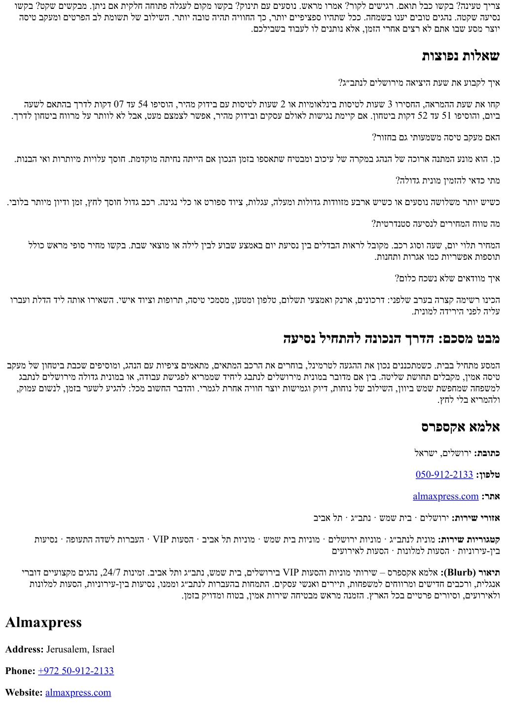 Service Areas: Jerusalem · Beit Shemesh · Ben Gurion Airport · Tel Aviv Service Categories: Taxi to Ben Gurion Airport · Jerusalem Taxi · Beit Shemesh Taxi · Tel Aviv Taxi · VIP Transfers · Airport Transfers · Intercity Rides · Hotel Transfers · Event Transfers Blurb: ALMA Express provides premium taxi and VIP transfer services in Jerusalem, Beit Shemesh, Ben Gurion Airport, and Tel Aviv. Available 24/7 with professional English-speaking drivers and modern, spacious vehicles for families, tourists, and business travelers. We specialize in airport transfers, intercity rides, hotel and event transport, and private tours across Israel. Book in advance for reliable, safe, on-time service.