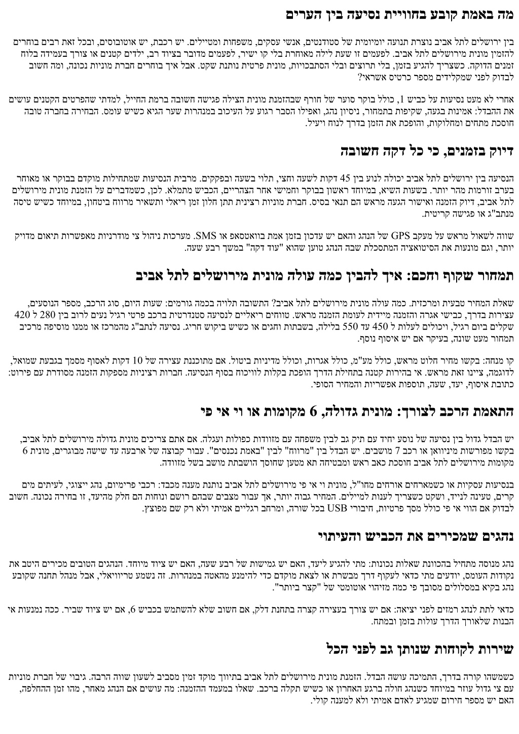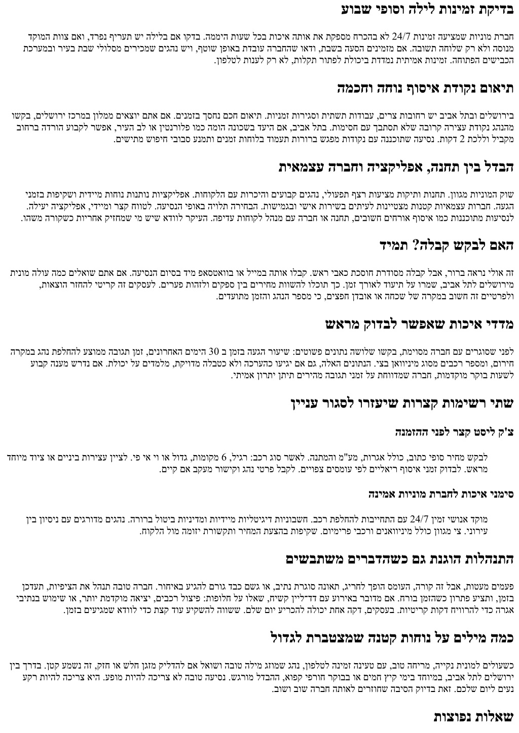 םירעה ןיב העיסנ תייווחב עבוק תמאב המ םירחוב םיבר תאז לכבו ,םיסובוטוא שי ,תבכר שי .םילייטמו תוחפשמ ,םיקסע ישנא ,םיטנדוטס לש תימוימוי העונת תרצונ ביבא לתל םילשורי ןיב חולב הדימעב ךרוצ וא םינטק םידלי ,בר דויצב רבודמ םימעפל ,רישי וק ילב תרחואמ הליל תעש וז םימעפל .ביבא לתל םילשורימ תינומ ןימזהל בושח המו ,הנוכנ תוינומ תרבח םירחוב ךיא לבא .טקש תנתונ תיטרפ תינומ ,תויוכבתסה ילבו םיצורת ילב ,ןמזב עיגהל ךירצשכ .הקודה םינמז ?יארשא סיטרכ רפסמ םידילקמש ינפל קודבל םישוע םינטקה םיטרפהש יתדמל ,לייחה תמרב הבושח השיגפ הליצה תינומ תנמזהבש ףרוח לש רעוס רקוב ללוכ ,1 שיבכ לע תועיסנ טעמ אל ירחא הבוט הרבחב הריחבה .סמוע שישכ איגה רעש תורהנמב בוכיעה לע עוגר רבסה וליפאו ,גהנ ןויסינ ,רוחמתב תופיקש ,העגב תונימא :לדבהה תא .ליעיו חונל ךרדב ןמזה תא תכפוהו ,תוקולחמו םיחתמ תכסוח הבושח הקד לכ יכ ,םינמזב קויד רחואמ וא רקובב םדקומ תוליחתמש תועיסנה תיברמ .םיקקפבו העשב יולת ,יצחו העשל תוקד 45 ןיב עונל הלוכי ביבא לתל םילשורי ןיב העיסנה םילשורימ תינומ תנמזה לע םירבדמשכ ,ןכל .אלמתמ שיבכה ,םיירהצה רחא ישימחו רקובב ןושאר דחוימב ,אישה תועשב .רתוי רהמ תומרוז ברעב הסיט שישכ דחוימב ,ןוחטיב חוורמ ריאשתו ילאיר ןמז ןולח ןתת תיניצר תוינומ תרבח .סיסב יאנת םה שארמ העגה רושיאו הנמזה קויד ,ביבא לתל .תיטירק השיגפ וא ג"בתנמ קיודמ םואית תורשפאמ תוינרדומ יצ לוהינ תוכרעמ .SMS וא פאסטאווב תמא ןמזב ןוכדע שי םאהו גהנה לש GPS בקעמ לע שארמ לואשל הווש .העש עבר ךשמב "הקד דוע" אוהש ןעוט גהנה הבש תלכסתמה היצאוטיסה תא תוענומ םגו ,רתוי ביבא לתל םילשורימ תינומ הלוע המכ ןיבהל ךיא :םכחו ףוקש רוחמת ,םיעסונה רפסמ ,בכרה גוס ,םויה תועש :םימרוג המכב היולת הבושתה ?ביבא לתל םילשורימ תינומ הלוע המכ .תיזכרמו תיעבט ריחמה תלאש 420 ל 280 ןיב בורל םיענ ליגר יטרפ בכרב תיטרדנטס העיסנל םיילאיר םיחווט .שארמ הנמזה תמועל תידיימ הנמזהו הרגא ישיבכ ,ךרדב תוריצע ביכרמ הפיסומ ונממ וא זכרמהמ ג"בתנל העיסנ .גירח שוקיב שישכ וא םיגחו תותבשב ,הלילב 550 דע 450 ל תולעל םילוכיו ,ליגר םויב םילקש .ףסונ ףוסיא שי םא רקיעב ,הנוש טעמ רוחמת ,לאומש תעבגב ךמסמ ףוסאל תוקד 10 לש הריצע תננכותמ םא .לוטיב תוינידמ ללוכו ,תורגא ללוכ ,מ"עמ ללוכ ,שארמ טולח ריחמ ושקב :החנמ וק :טוריפ םע תרדוסמ הנמזה תוקפסמ תויניצר תורבח .העיסנה ףוסב חוכיוול תולקב תכפוה ךרדה תליחתב הנטק תוריהב יא .שארמ תאז ונייצ ,המגודל .יפוסה ריחמהו תוירשפא תופסות ,העש ,דעי ,ףוסיא תבותכ יפ יא יו וא תומוקמ 6 ,הלודג תינומ :ךרוצל בכרה תמאתה ,ביבא לתל םילשורימ הלודג תינומ םיכירצ םתא םא .הלגעו תולופכ תודווזמ םע החפשמ ןיבל בג קית םע דיחי עסונ לש העיסנ ןיב לודג לדבה שי 6 תינומ ,םירגובמ השיש דע העברא לש הצובק רובע ."םיסנכנ תמאב" ןיבל "חוורמ" ןיב לדבה שי .םיבשומ 7 בכר וא ןאווינימ תושרופמ ושקב .הדווזמ לשב בשומ תתבשוה ךסוחש ןעטמ את החיטבמו שאר באכ תכסוח ביבא לתל םילשורימ תומוקמ םימ םיתיעל ,יגוציי גהנ ,םוימירפ יבכר :דבכמ הנעמ תנתונ ביבא לתל םילשורימ יפ יא יו תינומ ,ל"וחמ םיחרוא םיחראמשכ וא תויקסע תועיסנב בושח .הנוכנ הריחב וז ,דעיהמ קלח םה תוחונו םשור םהבש םיבצמ רובע ךא ,רתוי הובג ריחמה .םיליימל תונעל ךירצשכ טקשו ,דיינל הניעט ,םירק .ץצופמ םש קר אלו יתימא םיילגר בחרמו ,הרוש לכב USB ירוביח ,תויטרפ ךסמ ללוכ יפ יא יווה םא קודבל יותיעהו שיבכה תא םיריכמש םיגהנ תא בטיה םיריכמ םיבוטה םיגהנה .דחוימ דויצ שי םאה ,העש עבר לש תושימג שי םאה ,דעיל עיגהל יתמ :תונוכנ תולאש תנווכהב ליחתמ הסונמ גהנ עבוקש הנחת להנמ לבא ,ילאיווירט עמשנ הז .תורהנמב הטאהמ ענמיהל ידכ םדקומ תאצל וא תרשבמ ךרד ףוקעל יאדכ יתמ םיעדוי ,סמועה תודוקנ ."רתויב רצק" לש יטמוטוא יוהיזמ המכ יפ ךבוסמ םילולסמב איקב גהנ יא תוענמנ הככ .ריבש דויצ שי םא ,6 שיבכב שמתשהל אלש בושח םא ,קלד תנחתב הרצק הריצעב ךרוצ שי םא :האיצי ינפל םיזמר גהנל תתל יאד
