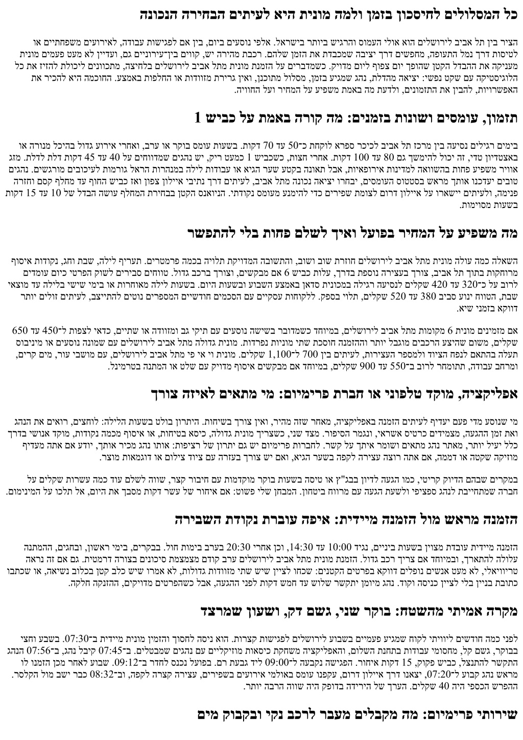 התיחנה ירחאו הנמזהה ינפל רדס ושעיש תורצק תומישר יתש :תואבה תומישרה יתש תא רומש ,םיטרפ ספספל ילב דחאה קילקה ןורתי תא לצנל ידכ יבשומ וא הלודג תינומ תשרדנ םאהו ,הסינכ דוק םע תקיודמ ףוסיא תדוקנ ,תקיודמ העש ,דויצ חפנ ,םיעסונ רפסמ ןייצ :הנמזהה ינפל .היצקילפאב הייבג רושיאל וא ןימז םולשת יעצמאל גאדו ,שארמ הריצע הצרת םא ןכדע ,שי םא ףדעומ לולסמ שקב :העיסנה ןמזב .תוחיטב תוקד יתש קחרמב הדוקנ םיתיעל .תומיסח םע הרצ הסינכב אל ,בכרל החונש שגפמ תדוקנ ןייצל דפקה ,עוריא ירחא םילשוריב ףוסיא ןימזמ התא םא .םירקניו םע הדימע תוקד םירשע ךוסחת הכילה תונורתפו תוצופנ תויועט :דחא םויב תובורמ תונמזה בוליש החטבאה ןמז תא ,םיניינב ןיב רבעמה יחוורמ תא םיחכוש םיבר ,עצמאב תושיגפ יתש םע ,הרזחו םילשוריל ביבא לת ןיב ץפוק התא ובש םויב הייהשה רוגסל וא ,דעי העשב ךילא רוזחל גהנה תא שארמ עבקל :ןורתפה .17:00־ל 15:30 ןיב ריעהמ האיציה יקקפ תאו ,הלשממ תוירקל הסינכב םיגהנ .ןכדע ,תנבהש עגרב ,ןורחאה עגרה לש יונישל שרדנ התא םא .90־ה הקדב השדח העיסנ תנמזהמ רתוי לוז הז תובר םימעפ .העש יפל .םאתהב הלדג םהלש תושימגהו ,םדקומ יוליג םיכירעמ םילשורי התוא איה "םילשורי" לכ אל :דעיב קויד ןיעו לבויה תיירק ומכ םירוזא .ףירעת םג םימעפל ,תוקד ףיסות באז תעבגו תומר ומכ ברעמ־ןופצ תונוכשל העיסנ .הנומתה תא הנשמ יפוסה דעיה דחוימב ,הרצק הכילה זאו ,תישארה הסינכב הניאש הדוקנב הדרוה בורל תשרוד הקיתעה ריעה .םילוחה יתב ביבס םיסומע תויהל םייושע םרכ םיענומ ולאה םיטרפה .תובוחר תוריגסב ןכדעתהל גהנהמ שקב ,םיגח תפוקתב תסנכ תיב וא םיעוריא םלואב רבודמ םא .הליפת תועשב וא םיעוריאב .םישיתמ םיפוקיע םיעובק תוחוקלל םירזוח םיגהנ המל :ישונאה ןפה ץילמי גהנה .תיעבט תופידע ולבקי ,תרדוסמ הרוצב םימלשמו ,םידעומ םידבכמ ,ןמזב םינכדעמש תוחוקל .חצנמ לגעמ םירצוי בוט גהנ םע ןומא יסחי ,ילטיגיד םלועב םג ,ףוסב .1 שיבכב שוביש שישכ יתריצי ןורתפ עיצי וליפאו ,יברש םוי הזשכ ןעטמה אתב םירק םימ רומשי ,םיפידע ןמז תונולח לע .הקספה אלל ילארשיה הנשה חול תא שרוחש לולסמב דחוימבו ,לדבהה תא השוע םדא לומ םדא תוצופנ תולאש ?םילשוריל ביבא לת ןיב העיסנ לש עצוממה ןמזה המ 45 דע 40 םיתיעל הלילב .תוקד 100 דע 80־ל םג עיגהל לוכי הז ,לודג עוריא שישכ וא סמוע תועשב .תוטקש תועשב תוקד 70 דע 50 ללכ ךרדב .תוקד ?םילשוריל ביבא לתמ תינומ הלוע המכ .םילקש 520 דע 380־ל ספטל םילולע גחו ישיש ,הליל .םילקש 420 דע 320־כ לש חווט בורל הארת םויה תועשב עובשה עצמאב הליגר העיסנל .רתוי הובג רחמותי יפ יא יו וא לודג בכר ?הלודג תינומ ןיבל יטרדנטס בכר ןיב רוחבל ךיא ביבא לתמ תומוקמ 6 תינומ ,םיעסונ השישל .ןאוו ופידעי רבכ תולודג תודווזמ יתש םע העברא .דויצה לש יתימאה חפנה תאו םיעסונה תא רפס .תורתוימ תוריצע יתשו שאר באכ ךוסחת םילשוריל ?תידיימ וא שארמ ןימזהל יאדכ םאה שארמ הנמזה גח יברעל וא םיפופצ םירקבל ךא ,ידיימ לע רמהל רשפא תודחוימ תושירד ילב םייניב תועשב .שארמ ףידע דימת ,שיגר ןמזה םא .םיבוכיע תכסוח ?יפ יא יו תורישל ליגר תוריש ןיב לדבהה המ םיאתמ .עוריאב וא הדשב תרדוסמ םינפ תלבק םיתיעלו ,טנרטניא ,הניעט ,םימ ומכ תויורשפא ,הסונמו עובק גהנ ,םילהנמ בכר בורל ללוכ יפ יא יו .םיחישק םינמז תוחולב תושיגר תושיגפו םילהנמ ,םיחרואל דחוימב