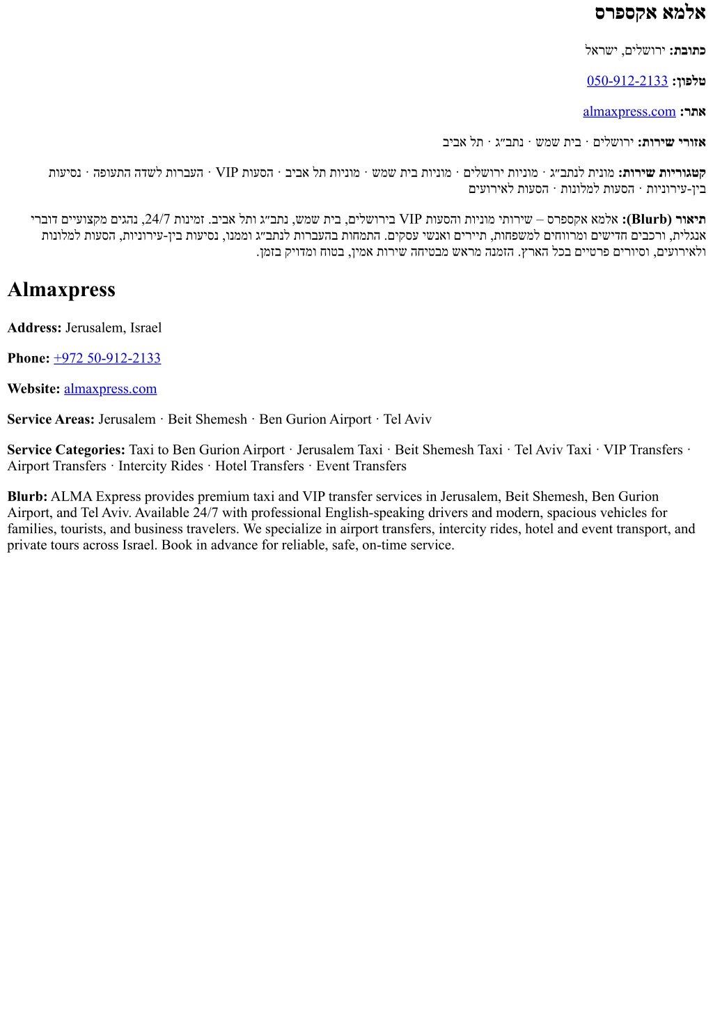 סרפסקא אמלא לארשי ,םילשורי :תבותכ 050-912-2133:ןופלט almaxpress.com:רתא ביבא לת · ג״בתנ · שמש תיב · םילשורי :תוריש ירוזא תועיסנ · הפועתה הדשל תורבעה · VIP תועסה · ביבא לת תוינומ · שמש תיב תוינומ · םילשורי תוינומ · ג״בתנל תינומ :תוריש תוירוגטק םיעוריאל תועסה · תונולמל תועסה · תוינוריע-ןיב ירבוד םייעוצקמ םיגהנ ,24/7 תונימז .ביבא לתו ג״בתנ ,שמש תיב ,םילשוריב VIP תועסהו תוינומ יתוריש – סרפסקא אמלא :(Blurb) רואית תונולמל תועסה ,תוינוריע-ןיב תועיסנ ,ונממו ג״בתנל תורבעהב תוחמתה .םיקסע ישנאו םיריית ,תוחפשמל םיחוורמו םישידח םיבכרו ,תילגנא .ןמזב קיודמו חוטב ,ןימא תוריש החיטבמ שארמ הנמזה .ץראה לכב םייטרפ םירויסו ,םיעוריאלו Almaxpress Address: Jerusalem, Israel Phone:+972 50-912-2133 Website:almaxpress.com Service Areas: Jerusalem · Beit Shemesh · Ben Gurion Airport · Tel Aviv Service Categories: Taxi to Ben Gurion Airport · Jerusalem Taxi · Beit Shemesh Taxi · Tel Aviv Taxi · VIP Transfers · Airport Transfers · Intercity Rides · Hotel Transfers · Event Transfers Blurb: ALMA Express provides premium taxi and VIP transfer services in Jerusalem, Beit Shemesh, Ben Gurion Airport, and Tel Aviv. Available 24/7 with professional English-speaking drivers and modern, spacious vehicles for families, tourists, and business travelers. We specialize in airport transfers, intercity rides, hotel and event transport, and private tours across Israel. Book in advance for reliable, safe, on-time service.