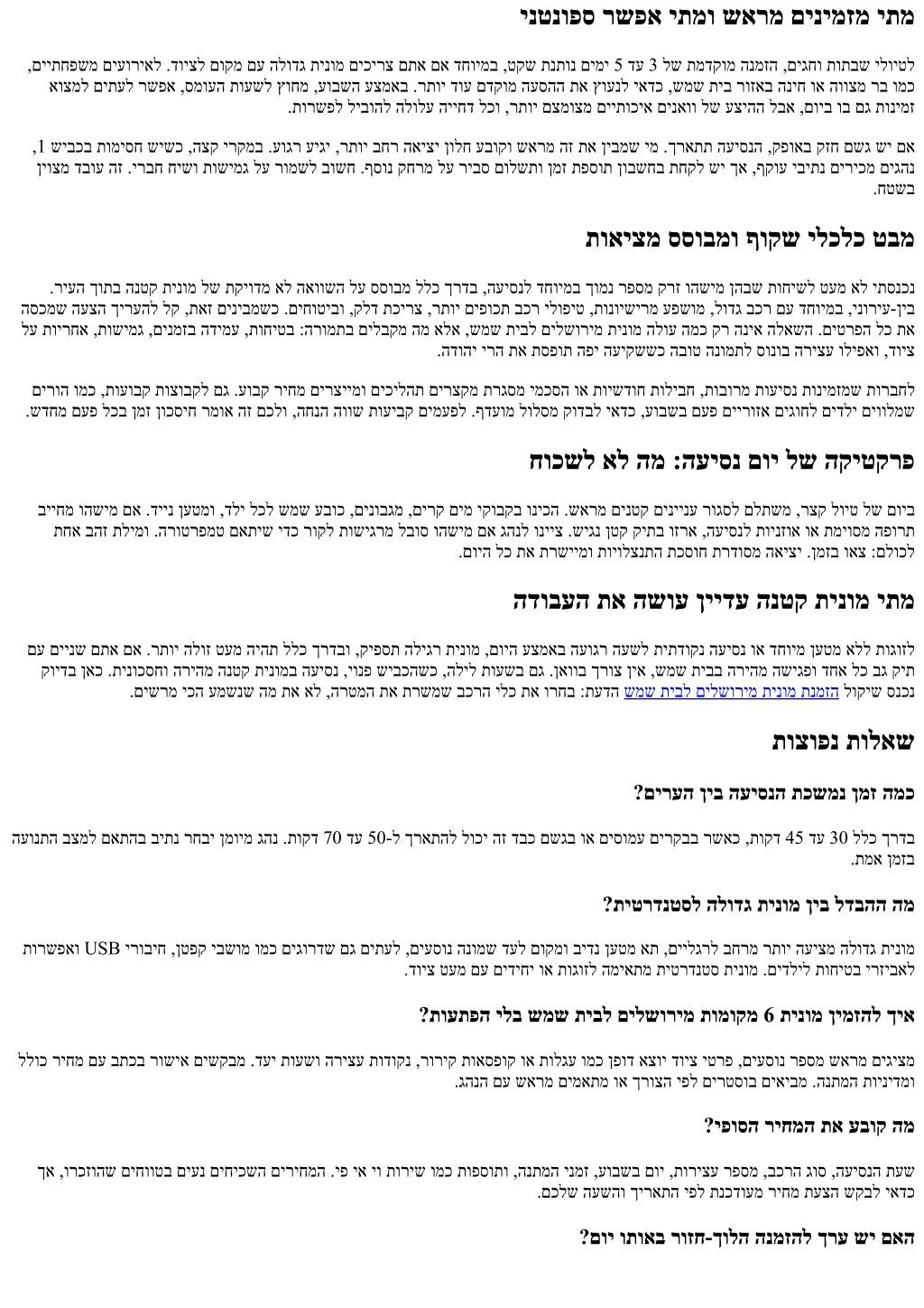 ינטנופס רשפא יתמו שארמ םינימזמ יתמ ,םייתחפשמ םיעוריאל .דויצל םוקמ םע הלודג תינומ םיכירצ םתא םא דחוימב ,טקש תנתונ םימי 5 דע 3 לש תמדקומ הנמזה ,םיגחו תותבש ילויטל אוצמל םיתעל רשפא ,סמועה תועשל ץוחמ ,עובשה עצמאב .רתוי דוע םדקומ העסהה תא ץוענל יאדכ ,שמש תיב רוזאב הניח וא הווצמ רב ומכ .תורשפל ליבוהל הלולע הייחד לכו ,רתוי םצמוצמ םייתוכיא םינאוו לש עציהה לבא ,םויב וב םג תונימז ,1 שיבכב תומיסח שישכ ,הצק ירקמב .עוגר עיגי ,רתוי בחר האיצי ןולח עבוקו שארמ הז תא ןיבמש ימ .ךראתת העיסנה ,קפואב קזח םשג שי םא ןיוצמ דבוע הז .ירבח חישו תושימג לע רומשל בושח .ףסונ קחרמ לע ריבס םולשתו ןמז תפסות ןובשחב תחקל שי ךא ,ףקוע יביתנ םיריכמ םיגהנ .חטשב תואיצמ ססובמו ףוקש ילכלכ טבמ .ריעה ךותב הנטק תינומ לש תקיודמ אל האוושה לע ססובמ ללכ ךרדב ,העיסנל דחוימב ךומנ רפסמ קרז והשימ ןהבש תוחישל טעמ אל יתסנכנ הסכמש העצה ךירעהל לק ,תאז םיניבמשכ .םיחוטיבו ,קלד תכירצ ,רתוי םיפוכת בכר ילופיט ,תונוישירמ עפשומ ,לודג בכר םע דחוימב ,ינוריע-ןיב לע תוירחא ,תושימג ,םינמזב הדימע ,תוחיטב :הרומתב םילבקמ המ אלא ,שמש תיבל םילשורימ תינומ הלוע המכ קר הניא הלאשה .םיטרפה לכ תא .הדוהי ירה תא תספות הפי העיקששכ הבוט הנומתל סונוב הריצע וליפאו ,דויצ םירוה ומכ ,תועובק תוצובקל םג .עובק ריחמ םירציימו םיכילהת םירצקמ תרגסמ ימכסה וא תוישדוח תוליבח ,תובורמ תועיסנ תונימזמש תורבחל .שדחמ םעפ לכב ןמז ןוכסיח רמוא הז םכלו ,החנה הווש תועיבק םימעפל .ףדעומ לולסמ קודבל יאדכ ,עובשב םעפ םיירוזא םיגוחל םידלי םיוולמש חוכשל אל המ :העיסנ םוי לש הקיטקרפ בייחמ והשימ םא .דיינ ןעטמו ,דלי לכל שמש עבוכ ,םינובגמ ,םירק םימ יקובקב וניכה .שארמ םינטק םיניינע רוגסל םלתשמ ,רצק לויט לש םויב תחא בהז תלימו .הרוטרפמט םאתיש ידכ רוקל תושיגרמ לבוס והשימ םא גהנל ונייצ .שיגנ ןטק קיתב וזרא ,העיסנל תוינזוא וא תמיוסמ הפורת .םויה לכ תא תרשיימו תויולצנתה תכסוח תרדוסמ האיצי .ןמזב ואצ :םלוכל הדובעה תא השוע ןיידע הנטק תינומ יתמ םע םיינש םתא םא .רתוי הלוז טעמ היהת ללכ ךרדבו ,קיפסת הליגר תינומ ,םויה עצמאב העוגר העשל תיתדוקנ העיסנ וא דחוימ ןעטמ אלל תוגוזל קוידב ןאכ .תינוכסחו הריהמ הנטק תינומב העיסנ ,יונפ שיבכהשכ ,הליל תועשב םג .ןאווב ךרוצ ןיא ,שמש תיבב הריהמ השיגפו דחא לכ בג קית .םישרמ יכה עמשנש המ תא אל ,הרטמה תא תרשמש בכרה ילכ תא ורחב :תעדה שמש תיבל םילשורימ תינומ תנמזה לוקיש סנכנ תוצופנ תולאש ?םירעה ןיב העיסנה תכשמנ ןמז המכ העונתה בצמל םאתהב ביתנ רחבי ןמוימ גהנ .תוקד 70 דע 50-ל ךראתהל לוכי הז דבכ םשגב וא םיסומע םירקבב רשאכ ,תוקד 45 דע 30 ללכ ךרדב .תמא ןמזב ?תיטרדנטסל הלודג תינומ ןיב לדבהה המ תורשפאו USB ירוביח ,ןטפק יבשומ ומכ םיגורדש םג םיתעל ,םיעסונ הנומש דעל םוקמו בידנ ןעטמ את ,םיילגרל בחרמ רתוי העיצמ הלודג תינומ .דויצ טעמ םע םידיחי וא תוגוזל המיאתמ תיטרדנטס תינומ .םידליל תוחיטב ירזיבאל ?תועתפה ילב שמש תיבל םילשורימ תומוקמ 6 תינומ ןימזהל ךיא ללוכ ריחמ םע בתכב רושיא םישקבמ .דעי תועשו הריצע תודוקנ ,רוריק תואספוק וא תולגע ומכ ןפוד אצוי דויצ יטרפ ,םיעסונ רפסמ שארמ םיגיצמ .גהנה םע שארמ םימאתמ וא ךרוצה יפל םירטסוב םיאיבמ .הנתמה תוינידמו ?יפוסה ריחמה תא עבוק המ ךא ,ורכזוהש םיחווטב םיענ םיחיכשה םיריחמה .יפ יא יו תוריש ומכ תופסותו ,הנתמה ינמז ,עובשב םוי ,תוריצע רפסמ ,בכרה גוס ,העיסנה תעש .םכלש העשהו ךיראתה יפל תנכדועמ ריחמ תעצה שקבל יאדכ ?םוי ותואב רוזח-ךולה הנמזהל ךרע שי םאה