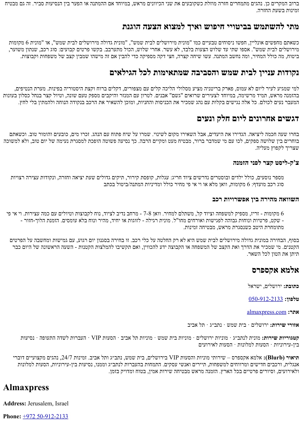 Website:almaxpress.com Service Areas: Jerusalem · Beit Shemesh · Ben Gurion Airport · Tel Aviv Service Categories: Taxi to Ben Gurion Airport · Jerusalem Taxi · Beit Shemesh Taxi · Tel Aviv Taxi · VIP Transfers · Airport Transfers · Intercity Rides · Hotel Transfers · Event Transfers Blurb: ALMA Express provides premium taxi and VIP transfer services in Jerusalem, Beit Shemesh, Ben Gurion Airport, and Tel Aviv. Available 24/7 with professional English-speaking drivers and modern, spacious vehicles for families, tourists, and business travelers. We specialize in airport transfers, intercity rides, hotel and event transport, and private tours across Israel. Book in advance for reliable, safe, on-time service.