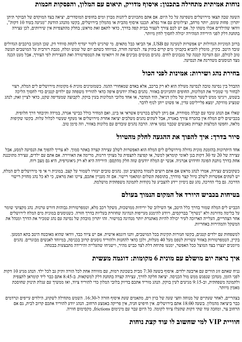תומכח תוקספהו ,ןולמה םע םואית ,קיודמ ףוסיא :ןונכתב הליחתמ תיתימא תוחונ ןתית רקובה לש םדקומה דצב האיצי ,םירדסומה םיפוחב םימו ץובמ תונהיל םינווכתמ םתא םא .םויה לכ לע העיפשמ םילשורימ ואצת הבש העשה ,”תוקד 10 דועב העיגמ“ תעדוה גהנהמ ושקב ,םילשוריב ןולמהמ וא תיבהמ ףוסיא וננכת .אלפנ רוא םע םימוליצו ,בחרמ רתוי ,סמוע תוחפ :ןורתי הריצע ןכל ,םיתוריש ןיא תויפצתהמ קלחב ;שארמ תאז םאתל יאדכ ,ךרדב הפק תיבב רוצעל ךרוצ םכל שי םא .לק והשמ ולכא םידליהש ואדוו .רתוימ ץחל ךוסחל הלוכי הריהמה הדיריה ינפל קלד תנחתב םילודגה םיבכרב ןגזמה ןכש ,קד רדווס תחקל ףידעי רוקל שיגרש ימ .םיאתמ לבכ ואיבה ךא ,USB םע הניעטל תורשפא שי תולודגה תוינומה בורב השעת םיבשומה לע תיברזר תבגמ ,חלמו שמש לש םוי םתשכ דחוימב ,הרזח העיסנל .דצ קיתב םירק םימ יקובקב איבהל ץלמומ ,ץיקב .בטיה דבוע הנכה טעמ לבא ,ךרוצה יפל תוריצעה תאו הרוטרפמטה תא ומיאתיו הז תא םיניבמ םיסונמ םיגהנ .םיחל םינובגמ לש הנטק הכרעה םגו ,םלוכל בוט .העיסנה תא תגרדשמ םיעסונה דצמ לוכה ינפל תונימא :תורישו גהנ תריחב יוצר ,חלמה םיל םילשורימ תומוקמ 6 תינומ םינימזמשכ .הגהה ירוחאמש םדאב אלא ,בכרב קר אל אוה הלועמ העיסנל הבוט העיסנ ןיב לדבהה הכילה ךוסחל ידכ םינטק םידלי םע החפשמ דירוהל יאדכ הפיא םיעדוי הלאכ םיגהנ .רוזאב םינוינחהו םיפוחה ,תונולמה תא ריכמש ימ רוחבל גהנל ;תאז ןייצל יאדכ ,טקש הפידעמש הצובקל .קקוב ןיעב תונולמה יבולמ דחא וא ,רבדמה דוה ,לאינד ןולמ לש קיודמה רעשל שממ ועיגיו ,שמשב .רבדל ףונל ןתיי טושפ וא ,ןידע טסיליילפ אצמי ,הקיזומ עיצמש .תיפולח ךרד רחביתו הדימב ,הרגא ישיבכ ללוכ ריחמה םאו ,טיב וא יארשא סיטרכב םלשל ןתינ םא ,תרדוסמ הלבק םע דבוע גהנה םא ולאש תופיקש ושקב .תולע לולכל יושעש ףקעמ וא םילשורימ תרחא האיצי םיבלשמ םיגהנ םיתעל לבא ,הרגאב ךרוצ חרכהב ןיא חלמה םיל םישיבכב .בוט ןמיס הזו ,רוזאב תונולמ םע םידבוע םיגהנ הברה .ותיא ועסנ רבכש םישנאמ תורצק תוצלמה ושפחו ,האלמ לויטהמ קלחל העגהה תא ךופהל ךיא :ךרדב רויס לבא ,עסמל העיסנה תא ךופהל ךירצ אל .ךומס רתאב הרצק הריצע בלשל תורשפאה אוה חלמה םיל םילשורימ הלודג תינומ תנמזהב תונורתיה דחא תננכותמ הריצע ,םידלי םע םתא םא .הריוואה תא המירמ ,תוגרד יקוצמ לע תיפצתל הציפק וא ,לשמל ןארמוק ימואל ןגב תוקד 30 דע 20 לש הריצע .חור בצמ םג איה ,תיפרגואיג קר אל איה הדיריה :םסקהמ קלח הזש םיעדוי חלמה םי ישנא .היגרנא שודיחו הגופה תנתונ ךרדב תחא ,חלמה םיל םילשורימ יפ יא יו תינומב .בצק לע רומשל ורזעי םיבוט םיגהנ .ןמז ביצקתב דומעל םיצור םתא םא שארמ גהנל ורמא ,הריצע םיעבוקשכ יושיר קיזחמ גהנ לכ אל יכ ,שארמ תאז ונייצ ,םכתא ןיינעמ הז םא .יושיר ימאתמו םולשת תפסותב ,ךרדומ רצק לויט בלשל תורשפא םיתעל שי .תמלשומ תיתחפשמ הנומתל תודוקנ לע עיבצהל עדיי ןויסינ םע גהנ ,הכרדה ילב םג .הכרדה םלועב ךומנה םוקמה לא דרויה שיבכב תוחיטב רמוש יעוצקמ גהנ .תונרע שרוד תוהובג תורוטרפמטו ,אלמ בכר לקשמ ,תוכשוממ תודירי לש בולישה ךא ,בטיה ללכ ךרדב רומש חלמה םיל שיבכה םילשוריל חלמה םימ תינומב םיעסונשכ .הרזח ךרדב תוילעב תרזוחש הגיהנה תופייעמ ענמיהל עדויו ,םיסקרבב ”ףרשנ“ אלו תגרודמ המילב לע תא להנמו ךרדה תא ריכמש גהנ םע העיסנ לש קהבומ ןורתי והז .רושימב הגיהנמ רתוי תרגתאמ תויהל הלוכי ריעל הכוראה היילעה ,םיירהצה רחא .תוירחאב תוריהמהו לקשמה .ןעטמה אתב בטיה חטבואמ אוהש ואדוו ,דבכ דויצ שי םא .תישיא אמגוד ונתו ,םיבשומה לכב תוניקת תורוגח ושקב ,םינטק םידלי םע תוחפשמל םיגהנ .םירגובמ םישנאל דחוימב ,הסינכב בורק םיעסונ דירוהלו תונחהל יאדכ ןכלו ,תולעמ 40 לעמ ספטל תויושע רוזאב תורוטרפמטה ,ץיקב .החטבב תועצבתמ הדיריהו היילעהש וחיגשיו ,ריהמ שיבכ דצל תלד תחיתפ וענמי ,רשפאה לככ לצומה דצב ורצעי םינמוימ תישעמ המגוד :תומוקמ 6 תינומ םע םלשומ םוי הארנ ךיא תוקד 10 עיגמ גהנה .דלי לכל בג קיתו הרוה לכל תחא הדווזמ םע ,תומר תנוכשב ת