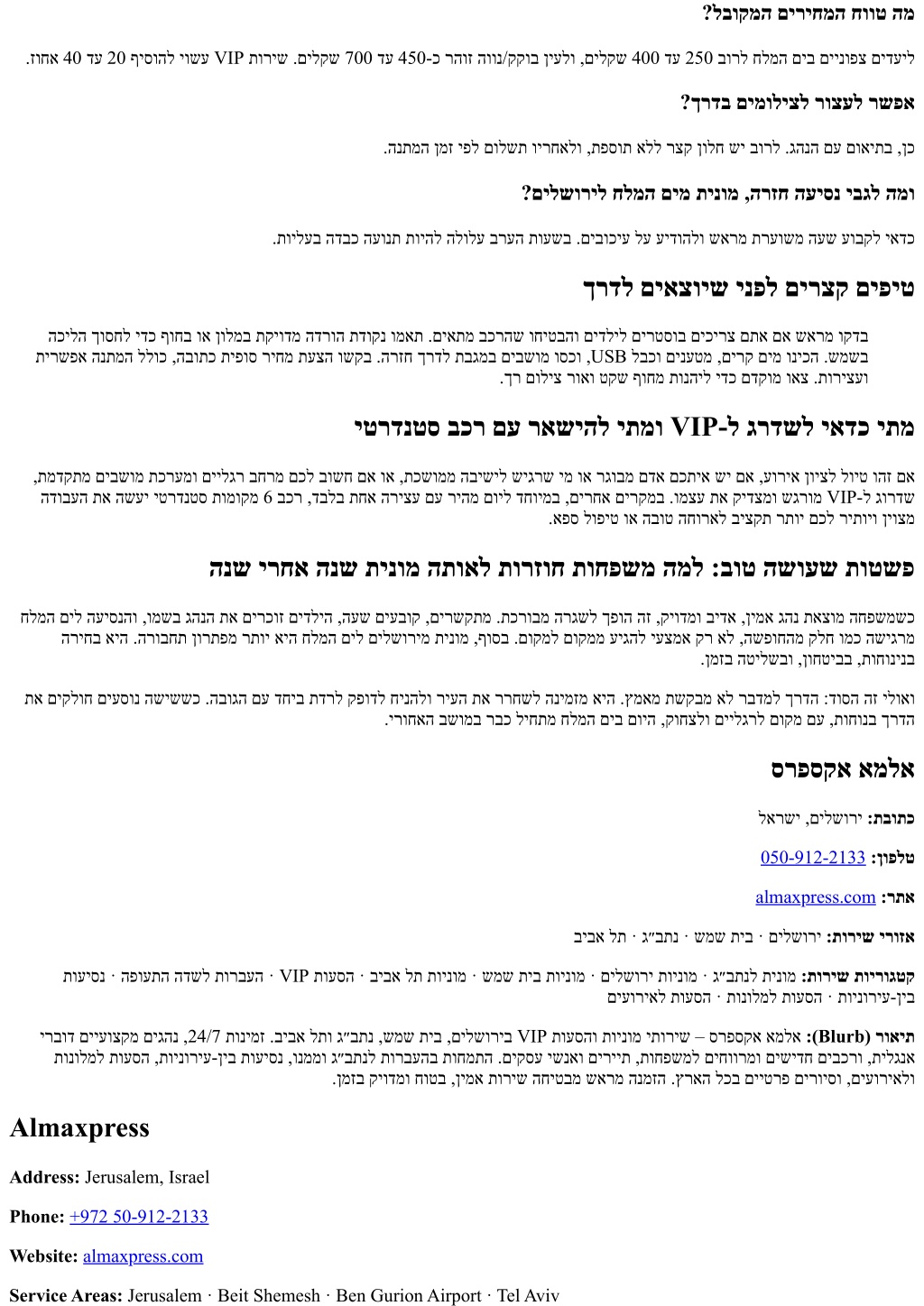 Service Categories: Taxi to Ben Gurion Airport · Jerusalem Taxi · Beit Shemesh Taxi · Tel Aviv Taxi · VIP Transfers · Airport Transfers · Intercity Rides · Hotel Transfers · Event Transfers Blurb: ALMA Express provides premium taxi and VIP transfer services in Jerusalem, Beit Shemesh, Ben Gurion Airport, and Tel Aviv. Available 24/7 with professional English-speaking drivers and modern, spacious vehicles for families, tourists, and business travelers. We specialize in airport transfers, intercity rides, hotel and event transport, and private tours across Israel. Book in advance for reliable, safe, on-time service.