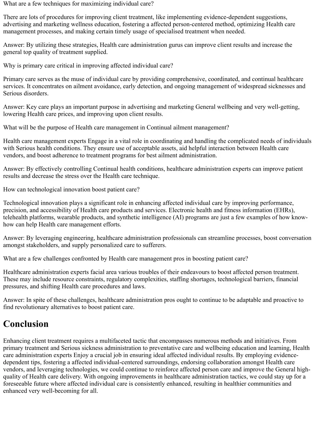What are a few techniques for maximizing individual care? There are lots of procedures for improving client treatment, like implementing evidence-dependent suggestions, advertising and marketing wellness education, fostering a affected person-centered method, optimizing Health care management processes, and making certain timely usage of specialised treatment when needed. Answer: By utilizing these strategies, Health care administration gurus can improve client results and increase the general top quality of treatment supplied. Why is primary care critical in improving affected individual care? Primary care serves as the muse of individual care by providing comprehensive, coordinated, and continual healthcare services. It concentrates on ailment avoidance, early detection, and ongoing management of widespread sicknesses and Serious disorders. Answer: Key care plays an important purpose in advertising and marketing General wellbeing and very well-getting, lowering Health care prices, and improving upon client results. What will be the purpose of Health care management in Continual ailment management? Health care management experts Engage in a vital role in coordinating and handling the complicated needs of individuals with Serious health conditions. They ensure use of acceptable assets, aid helpful interaction between Health care vendors, and boost adherence to treatment programs for best ailment administration. Answer: By effectively controlling Continual health conditions, healthcare administration experts can improve patient results and decrease the stress over the Health care technique. How can technological innovation boost patient care? Technological innovation plays a significant role in enhancing affected individual care by improving performance, precision, and accessibility of Health care products and services. Electronic health and fitness information (EHRs), telehealth platforms, wearable products, and synthetic intelligence (AI) programs are just a few examples of how know- how can help Health care management efforts. Answer: By leveraging engineering, healthcare administration professionals can streamline processes, boost conversation amongst stakeholders, and supply personalized care to sufferers. What are a few challenges confronted by Health care management pros in boosting patient care? Healthcare administration experts facial area various troubles of their endeavours to boost affected person treatment. These may include resource constraints, regulatory complexities, staffing shortages, technological barriers, financial pressures, and shifting Health care procedures and laws. Answer: In spite of these challenges, healthcare administration pros ought to continue to be adaptable and proactive to find revolutionary alternatives to boost patient care. Conclusion Enhancing client treatment requires a multifaceted tactic that encompasses numerous methods and initiatives. From primary treatment and Serious sickness administration to preventative care and wellbeing education and learning, Health care administration experts Enjoy a crucial job in ensuring ideal affected individual results. By employing evidence- dependent tips, fostering a affected individual-centered surroundings, endorsing collaboration amongst Health care vendors, and leveraging technologies, we could continue to reinforce affected person care and improve the General high- quality of Health care delivery. With ongoing improvements in healthcare administration tactics, we could stay up for a foreseeable future where affected individual care is consistently enhanced, resulting in healthier communities and enhanced very well-becoming for all.
