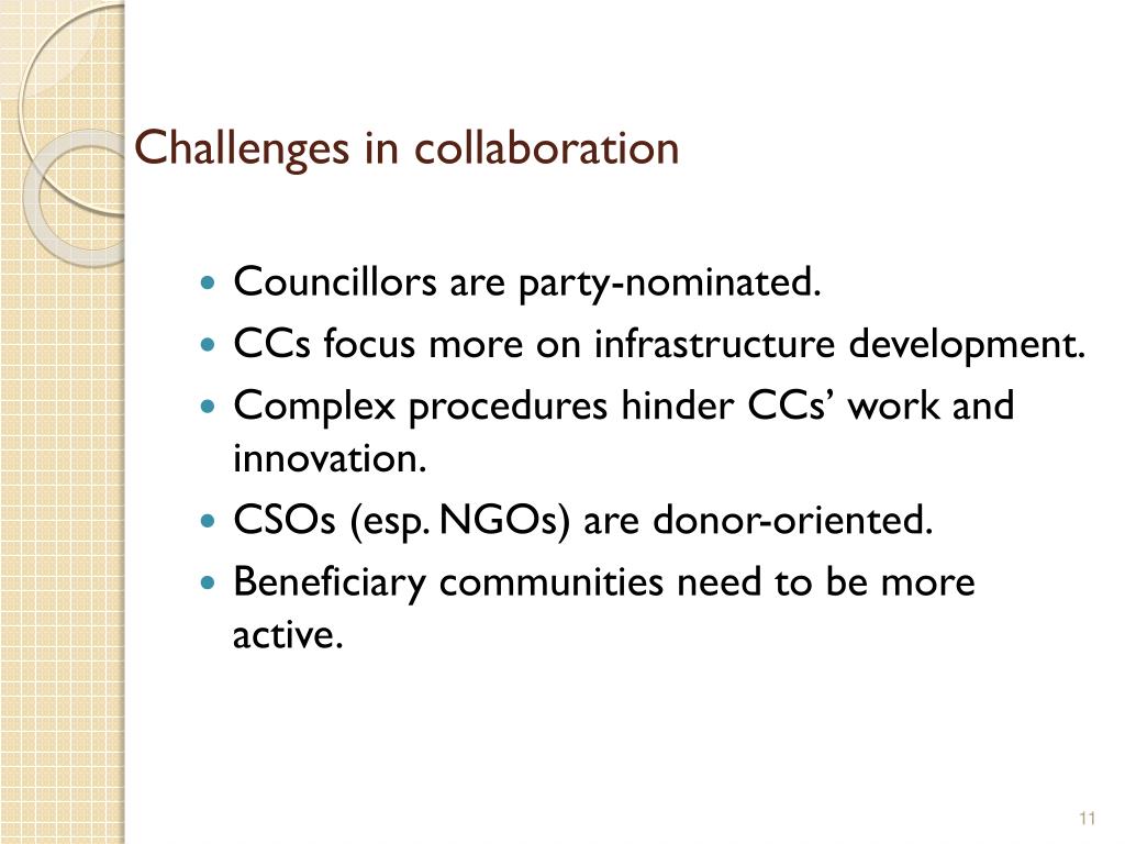 Challenges in collaboration • Councillors are party-nominated. • CCs focus more on infrastructure development. • Complex procedures hinder CCs’ work and innovation. • CSOs (esp. NGOs) are donor-oriented. • Beneficiary communities need to be more active.