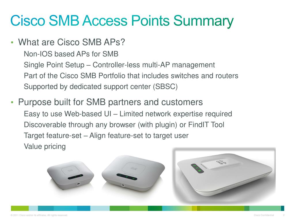Cisco SMB Access Points Summary • What are Cisco SMB APs? • Non-IOS based APs for SMB • Single Point Setup – Controller-less multi-AP management • Part of the Cisco SMB Portfolio that includes switches and routers • Supported by dedicated support center (SBSC) • Purpose built for SMB partners and customers • Easy to use Web-based UI – Limited network expertise required • Discoverable through any browser (with plugin) or FindIT Tool • Target feature-set – Align feature-set to target user • Value pricing
