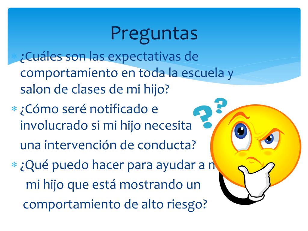 Preguntas ¿Cuáles son lasexpectativas de comportamiento en toda la escuela y salon de clases de mi hijo? ¿Cómoserénotificado e involucradosi mi hijonecesita unaintervención de conducta? ¿Quépuedohacer para ayudar a mi mi hijoqueestámostrando un comportamiento de alto riesgo?