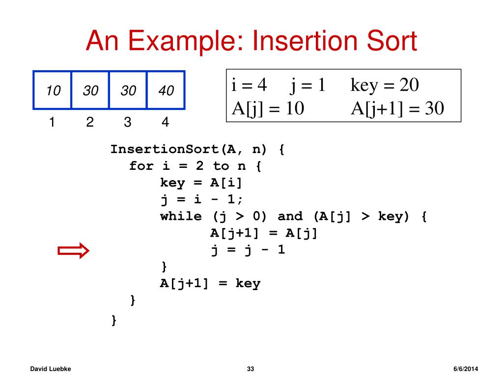 An Example: Insertion Sort i = 2 j = 1 key = 10A[j] = 30 A[j+1] = 10 30 10 40 20 InsertionSort(A, n) {for i = 2 to n { key = A[i] j = i - 1; while (j > 0) and (A[j] > key) { A[j+1] = A[j] j = j - 1 } A[j+1] = key} } 1 2 3 4 David Luebke 94/1/2011