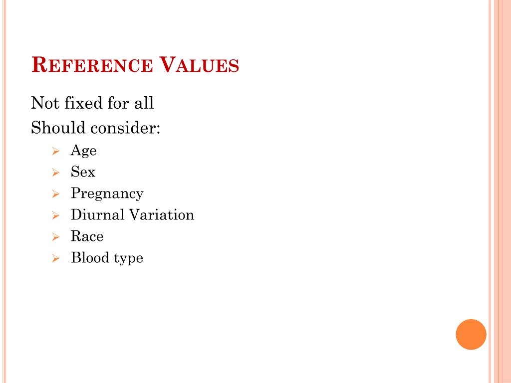 Reference Values Not fixed for all Should consider: • Age • Sex • Pregnancy • Diurnal Variation • Race • Blood type