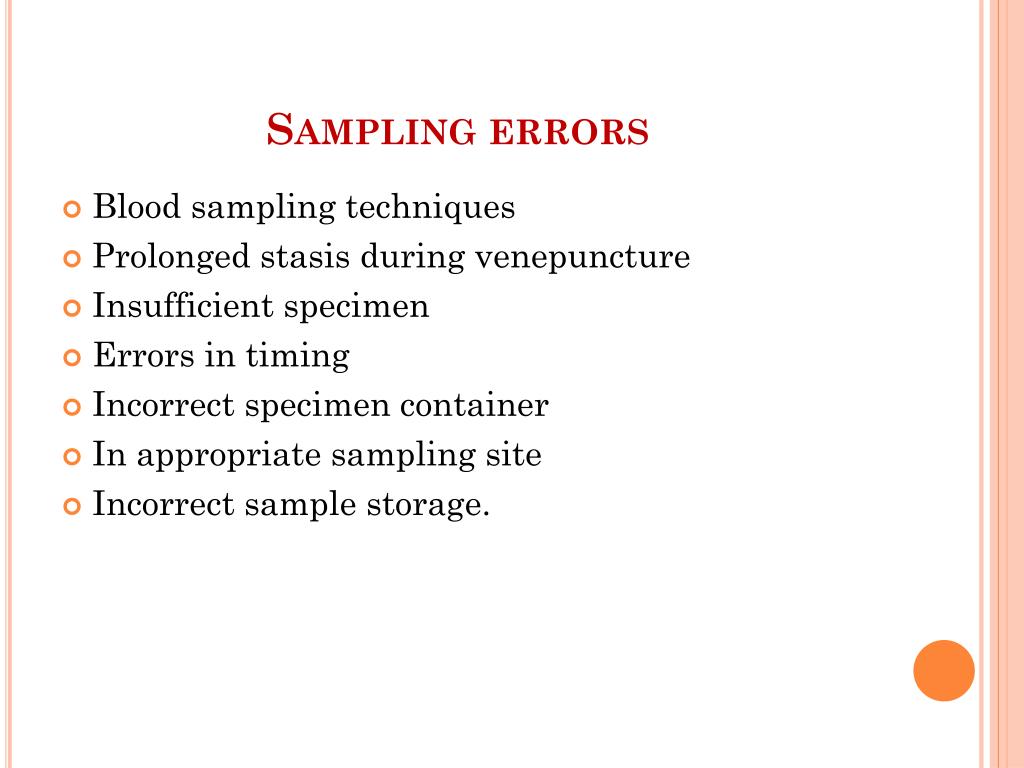 Sampling errors • Blood sampling techniques • Prolonged stasis during venepuncture • Insufficient specimen • Errors in timing • Incorrect specimen container • In appropriate sampling site • Incorrect sample storage.