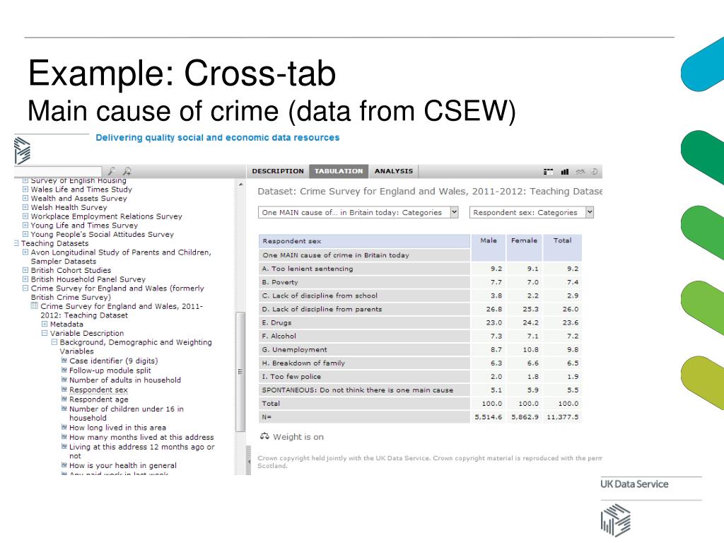 Nesstar: online analysis of survey data • browse detailed information (metadata) and data online • do simple data analysis and visualisation on microdata • download a subset of data in one of a number of formats (e.g. SPSS, Stata)