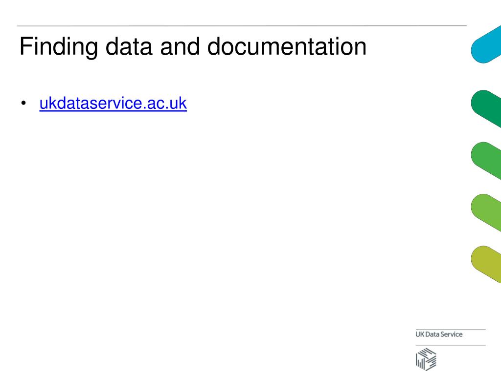 Documentation • all survey documentation is freely available on the website – questionnaires, user guides, technical reports, derived variables • documentation tells you about the data • what questions were asked • who were asked the questions • how the survey was conducted • what was done with the raw data to turn it into the final data You must look at the documentation to understand the data