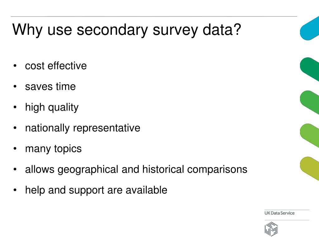 Why use secondary survey data? • cost effective • saves time • high quality • nationally representative • many topics • allows geographical and historical comparisons • help and support are available