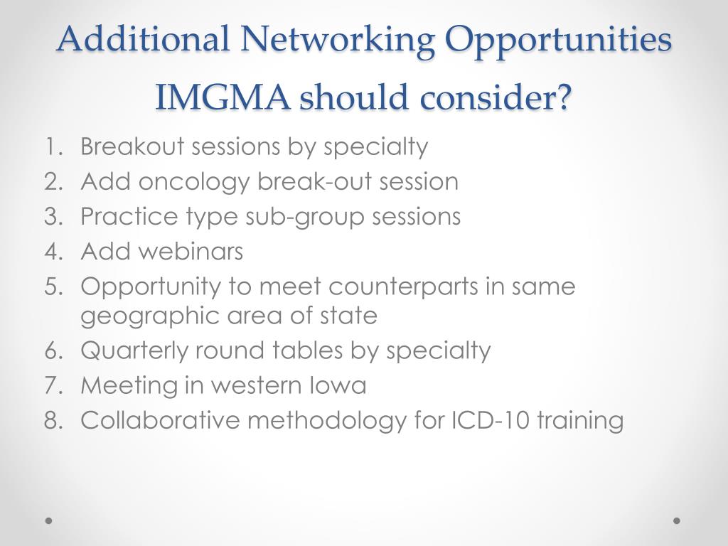 Additional Networking Opportunities IMGMA should consider? • Breakout sessions by specialty • Add oncology break-out session • Practice type sub-group sessions • Add webinars • Opportunity to meet counterparts in same geographic area of state • Quarterly round tables by specialty • Meeting in western Iowa • Collaborative methodology for ICD-10 training