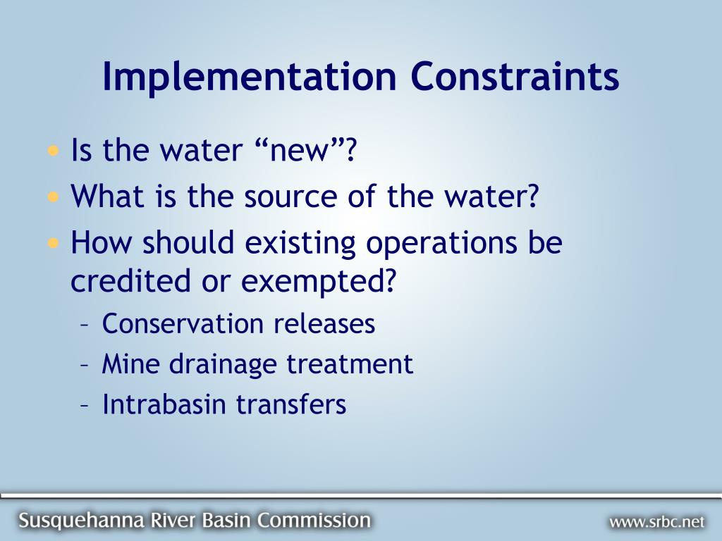 Implementation Constraints • Is the water “new”? • What is the source of the water? • How should existing operations be credited or exempted? • Conservation releases • Mine drainage treatment • Intrabasin transfers