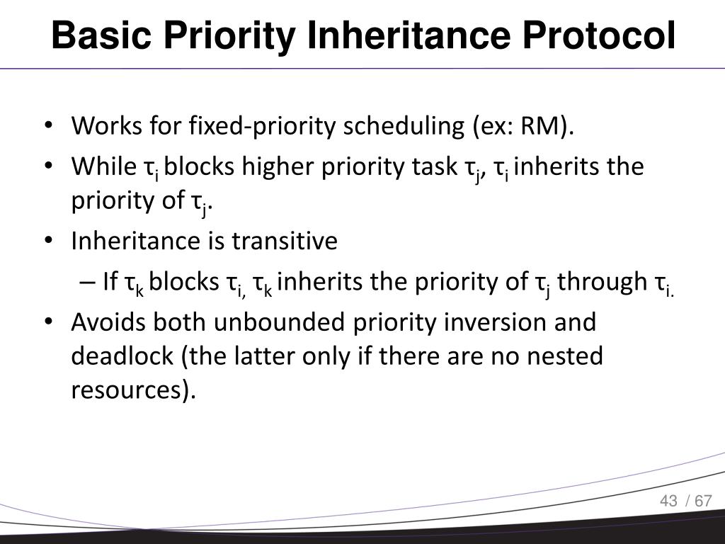 Basic Priority Inheritance Protocol • Works for fixed-priority scheduling (ex: RM). • While τiblocks higher priority task τj, τiinherits the priority of τj. • Inheritance is transitive • If τk blocks τi,τk inherits the priority of τj through τi. • Avoids both unbounded priority inversion and deadlock (the latter only if there are no nested resources).