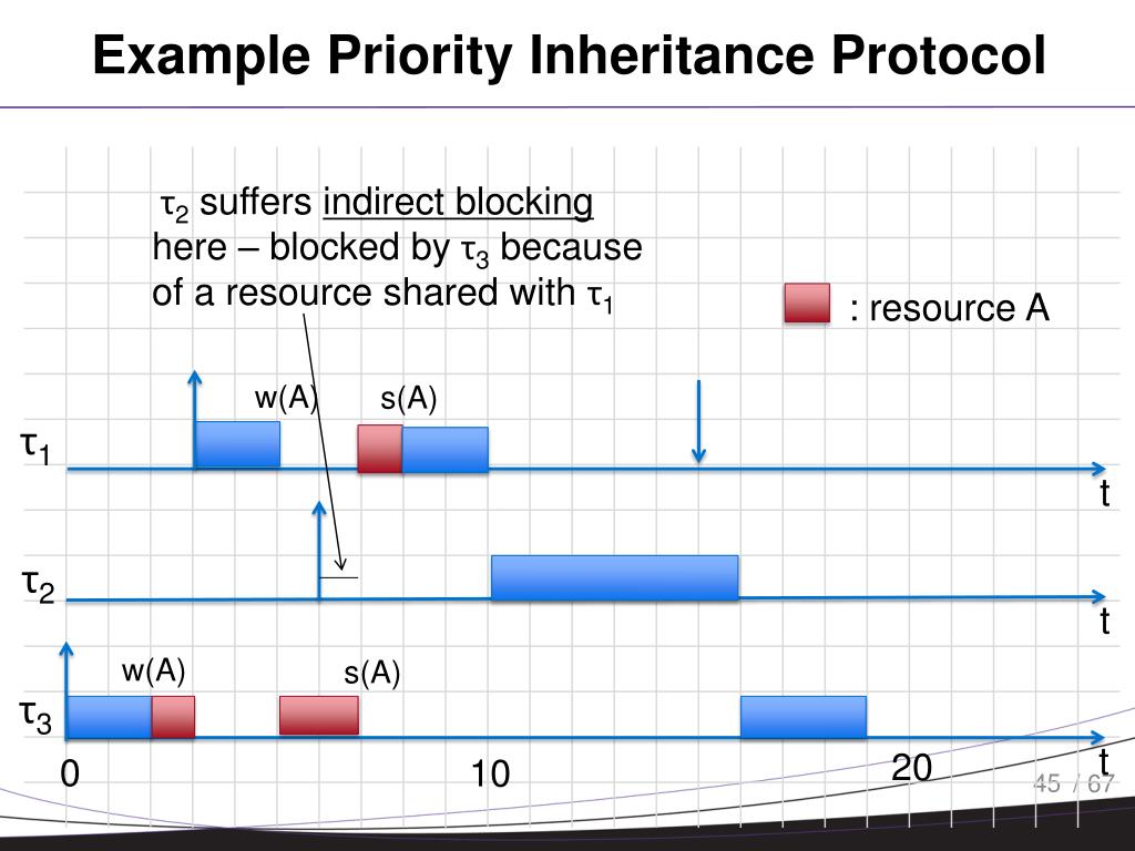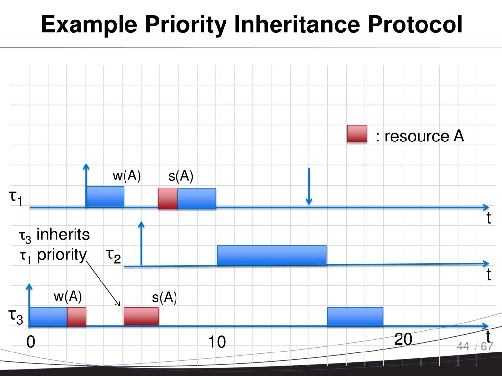 Example Priority Inheritance Protocol : resource A w(A) s(A) τ1 t τ3 inherits τ1 priority τ2 t w(A) s(A) τ3 t 20 0 10