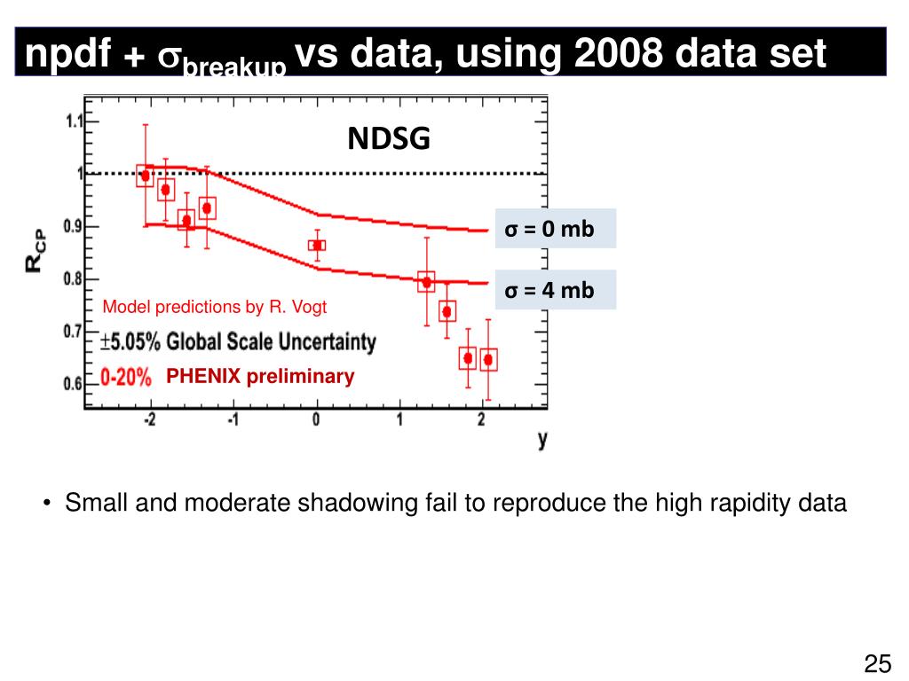 npdf + breakup vs data, using 2008 data set NDSG σ = 0 mb Model predictions by R. Vogt σ = 4 mb PHENIX preliminary • Small and moderate shadowing fail to reproduce the high rapidity data