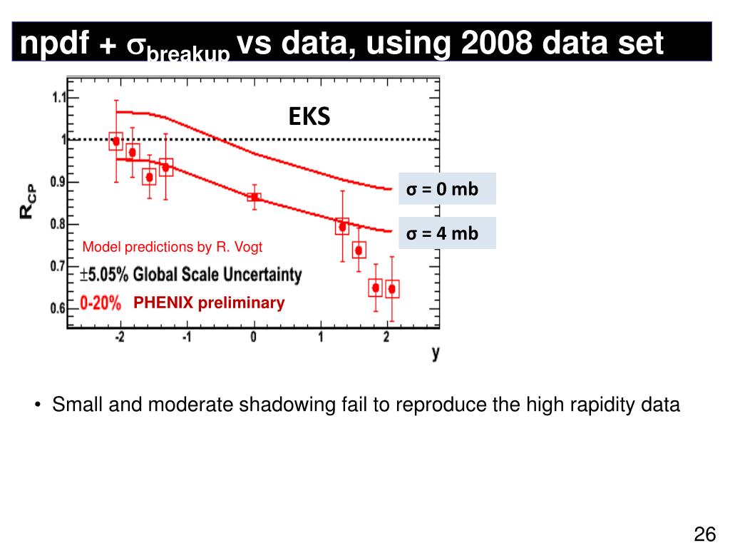npdf + breakup vs data, using 2008 data set EKS Model predictions by R. Vogt σ = 0 mb PHENIX preliminary σ = 4 mb • Small and moderate shadowing fail to reproduce the high rapidity data