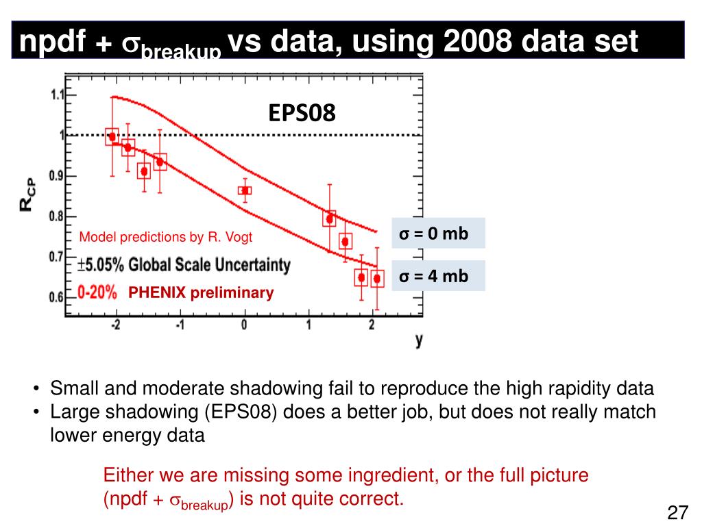 npdf + breakup vs data, using 2008 data set EPS08 Model predictions by R. Vogt σ = 0 mb PHENIX preliminary σ = 4 mb • Small and moderate shadowing fail to reproduce the high rapidity data • Large shadowing (EPS08) does a better job, but does not really match lower energy data Either we are missing some ingredient, or the full picture (npdf + breakup) is not quite correct.