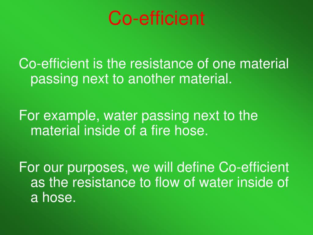 Co-efficient Co-efficient is the resistance of one material passing next to another material. For example, water passing next to the material inside of a fire hose. For our purposes, we will define Co-efficient as the resistance to flow of water inside of a hose.