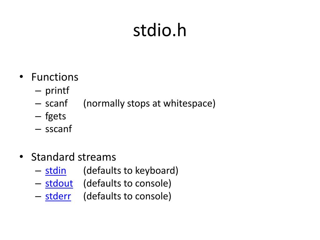 stdio.h • Functions • printf • scanf (normally stops at whitespace) • fgets • sscanf • Standard streams • stdin (defaults to keyboard) • stdout (defaults to console) • stderr (defaults to console)